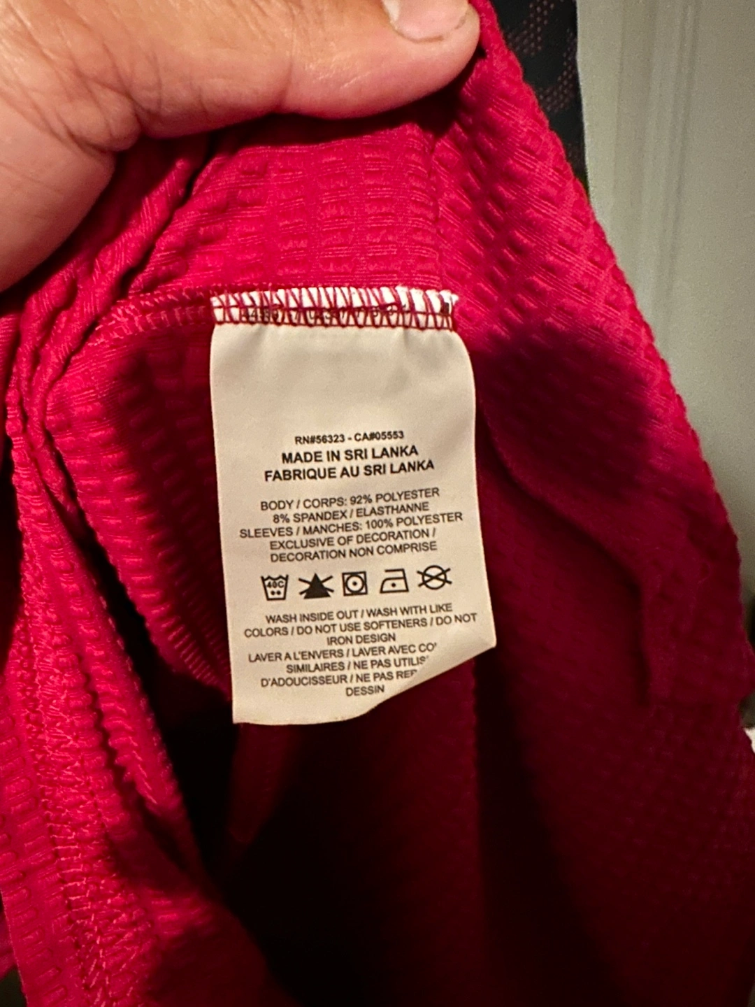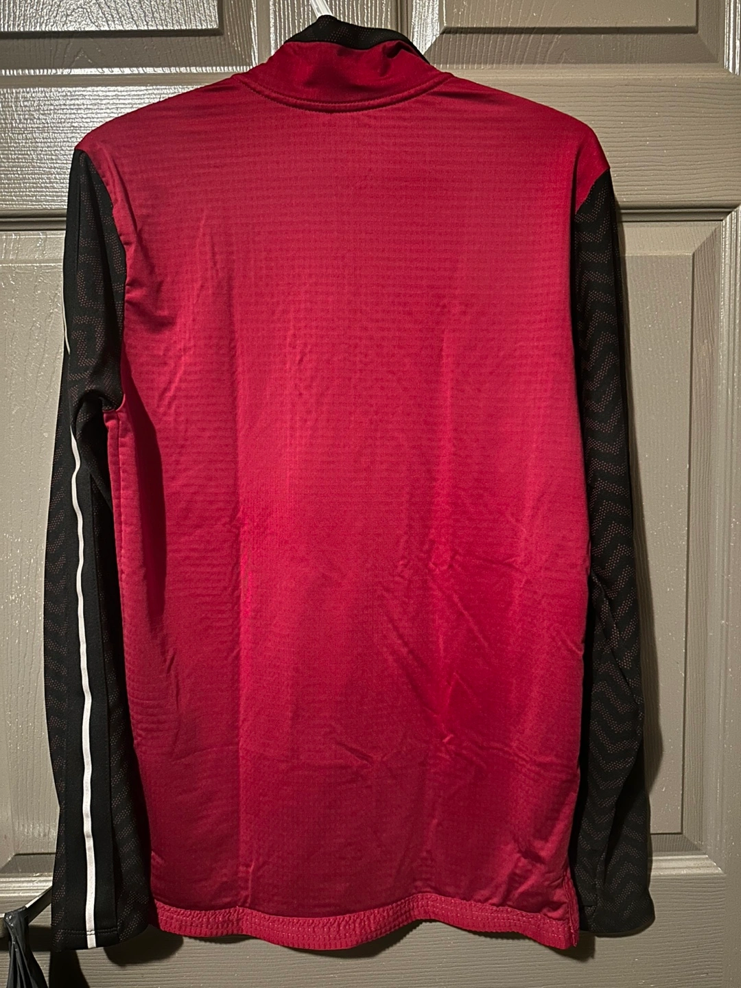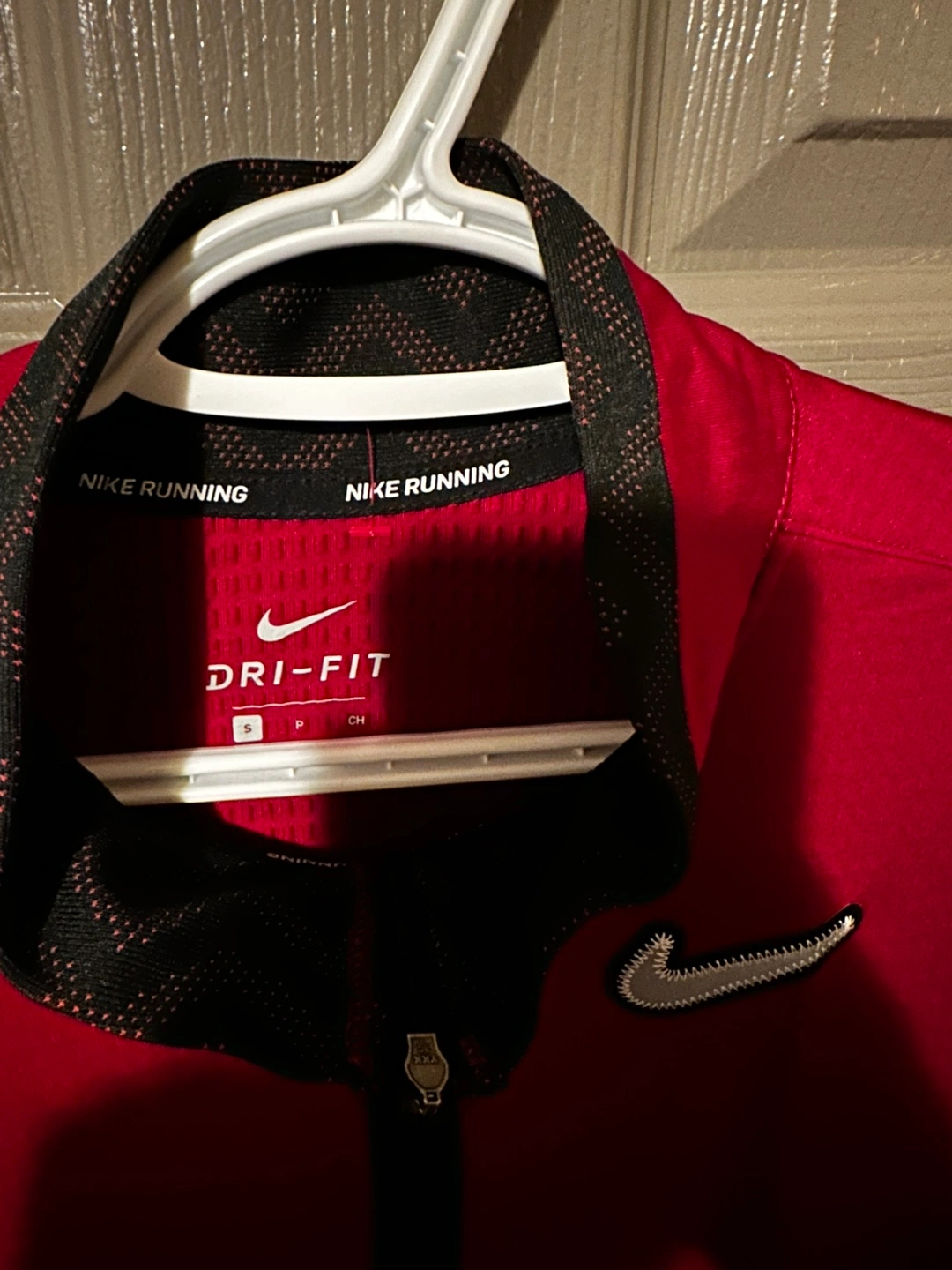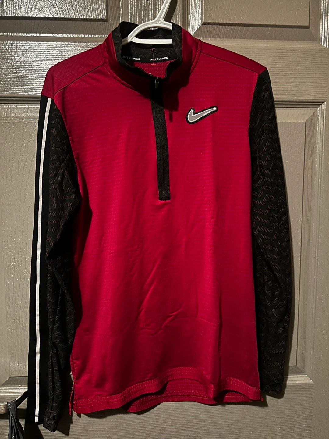 Selling a Nike Running Dri-FIT pullover in size small. It's a red and black colour combination. The body is made of 92% polyester and 8% spandex. Sleeves are 100% polyester. Great for running or other activities!