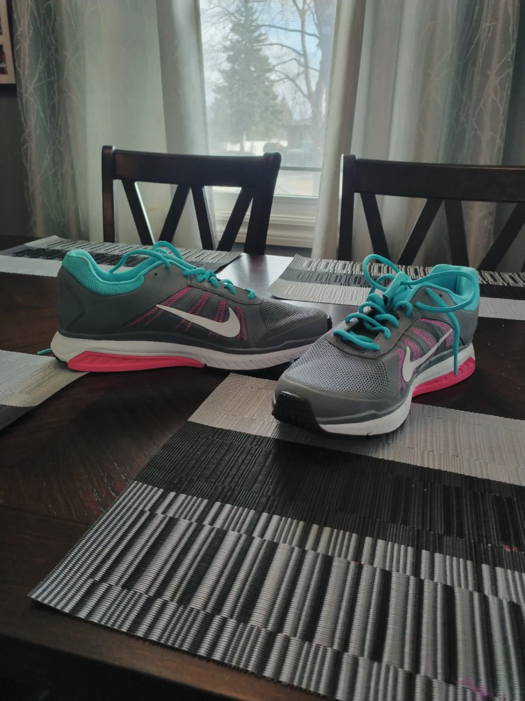 12Selling a pair of Nike running shoes in great condition! They feature a stylish combination of grey, pink, and turquoise. Perfect for your next run or workout!