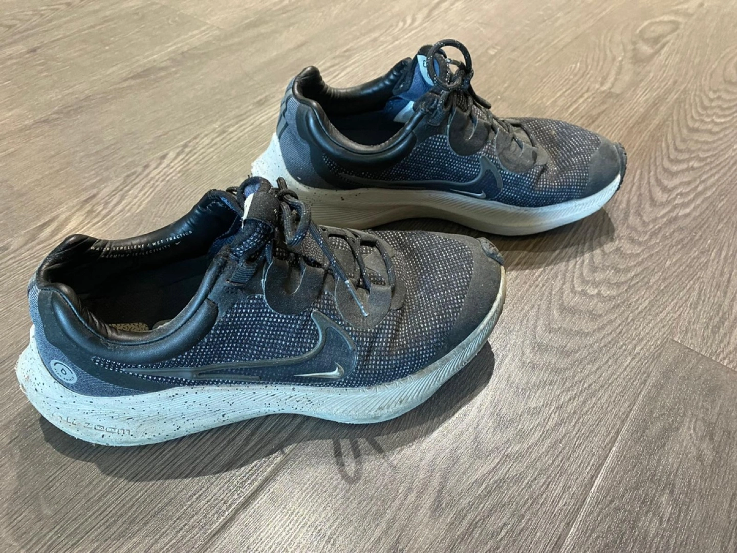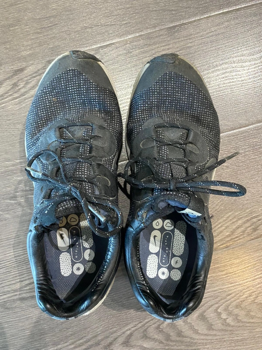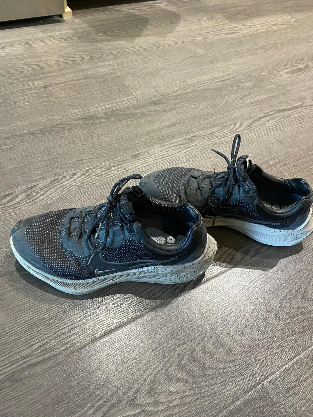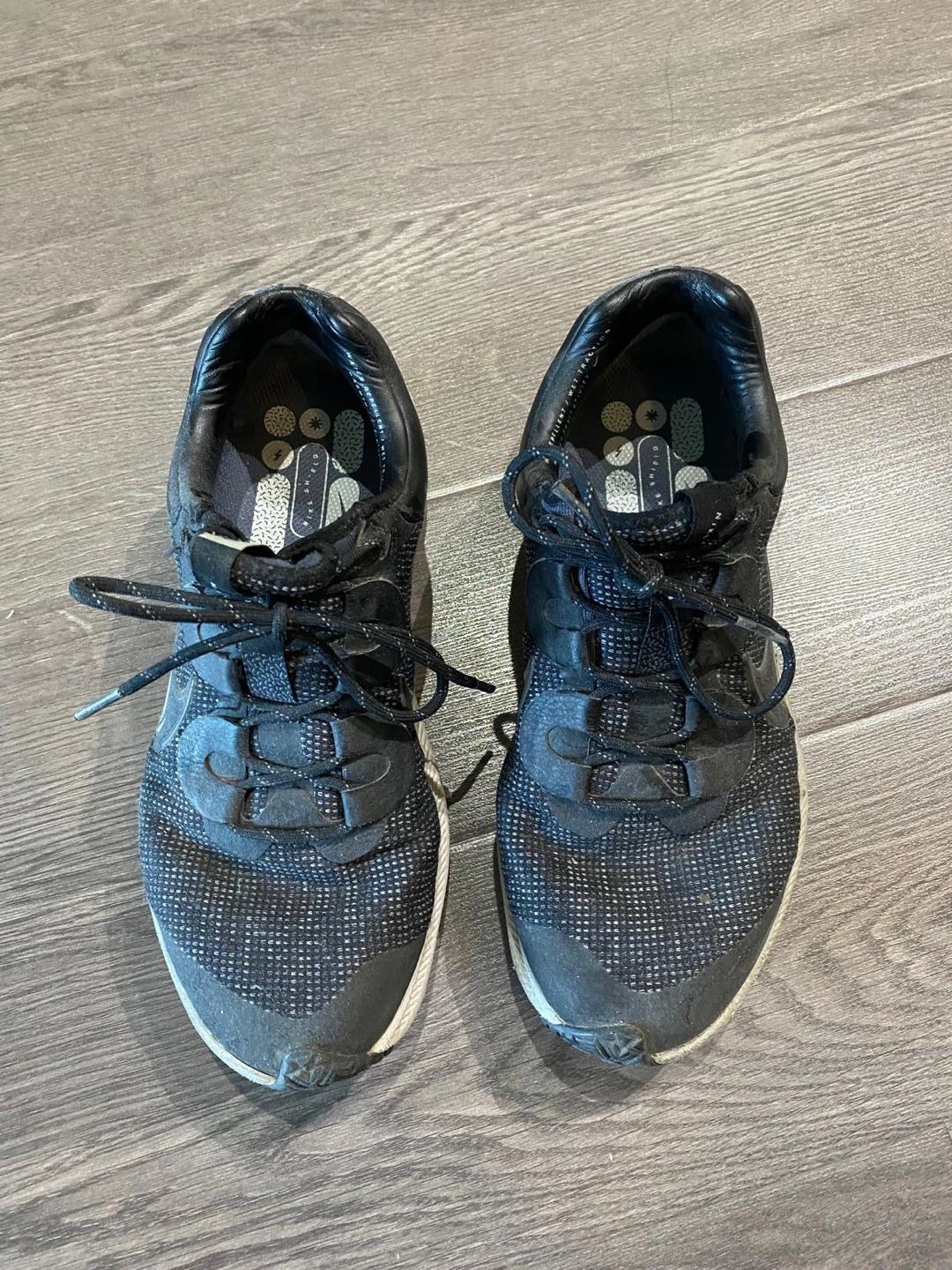 Selling a pair of Nike running shoes. They show some signs of wear, as you can see in the photos. They would be great for someone looking for a budget-friendly option for running or everyday wear. Size is not indicated on the shoe.