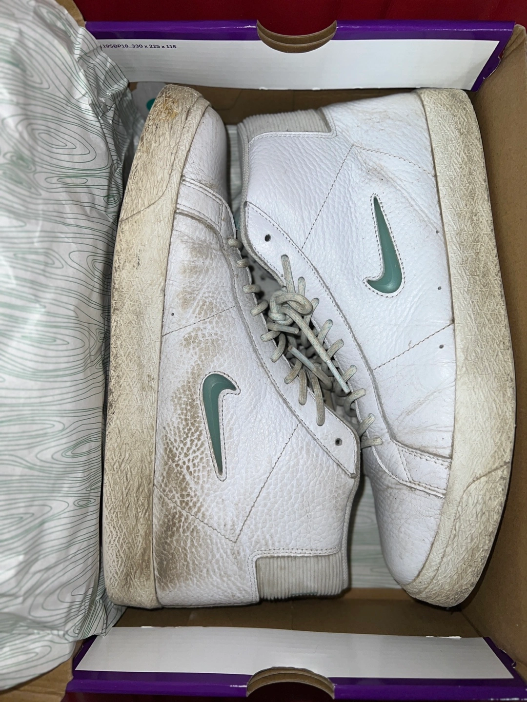 5Pair of used Nike SB Blazer Mid Premium. White leather upper, light green swoosh. Some wear and tear visible.