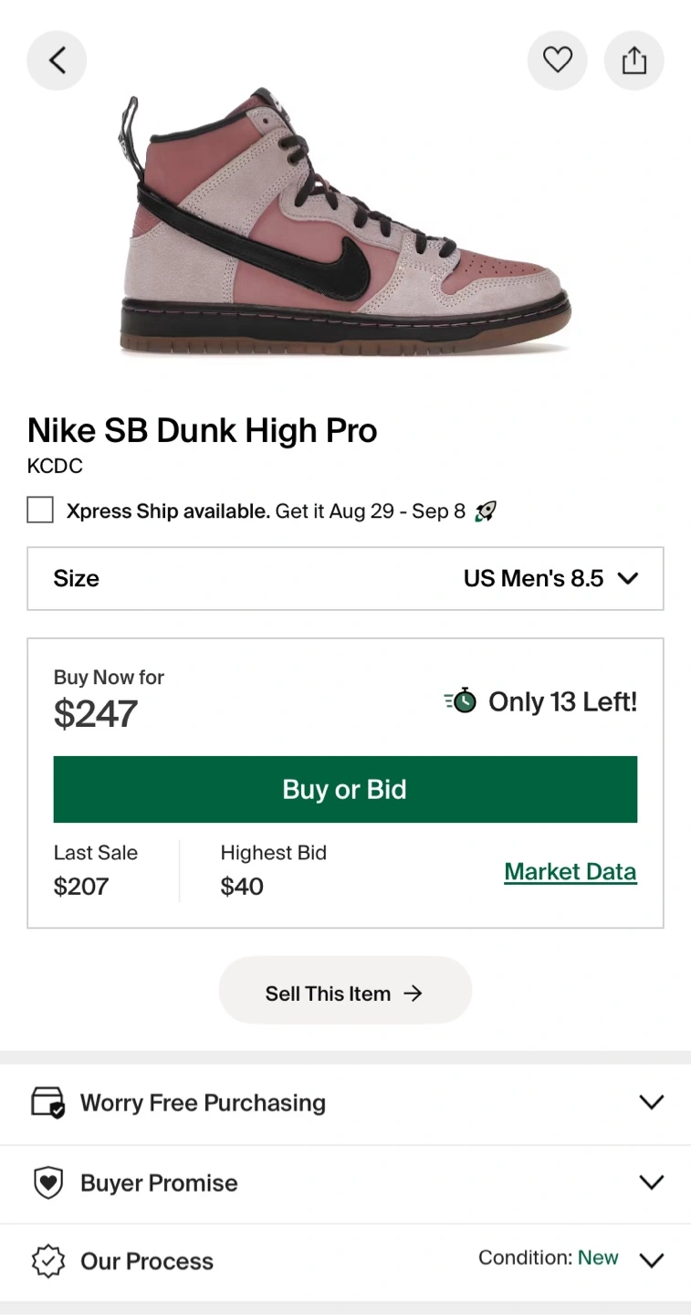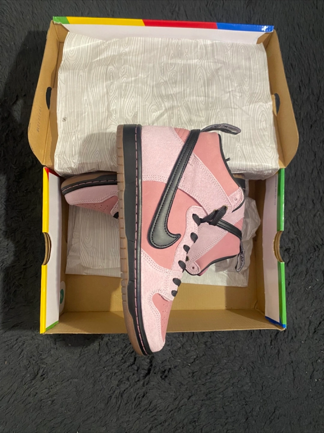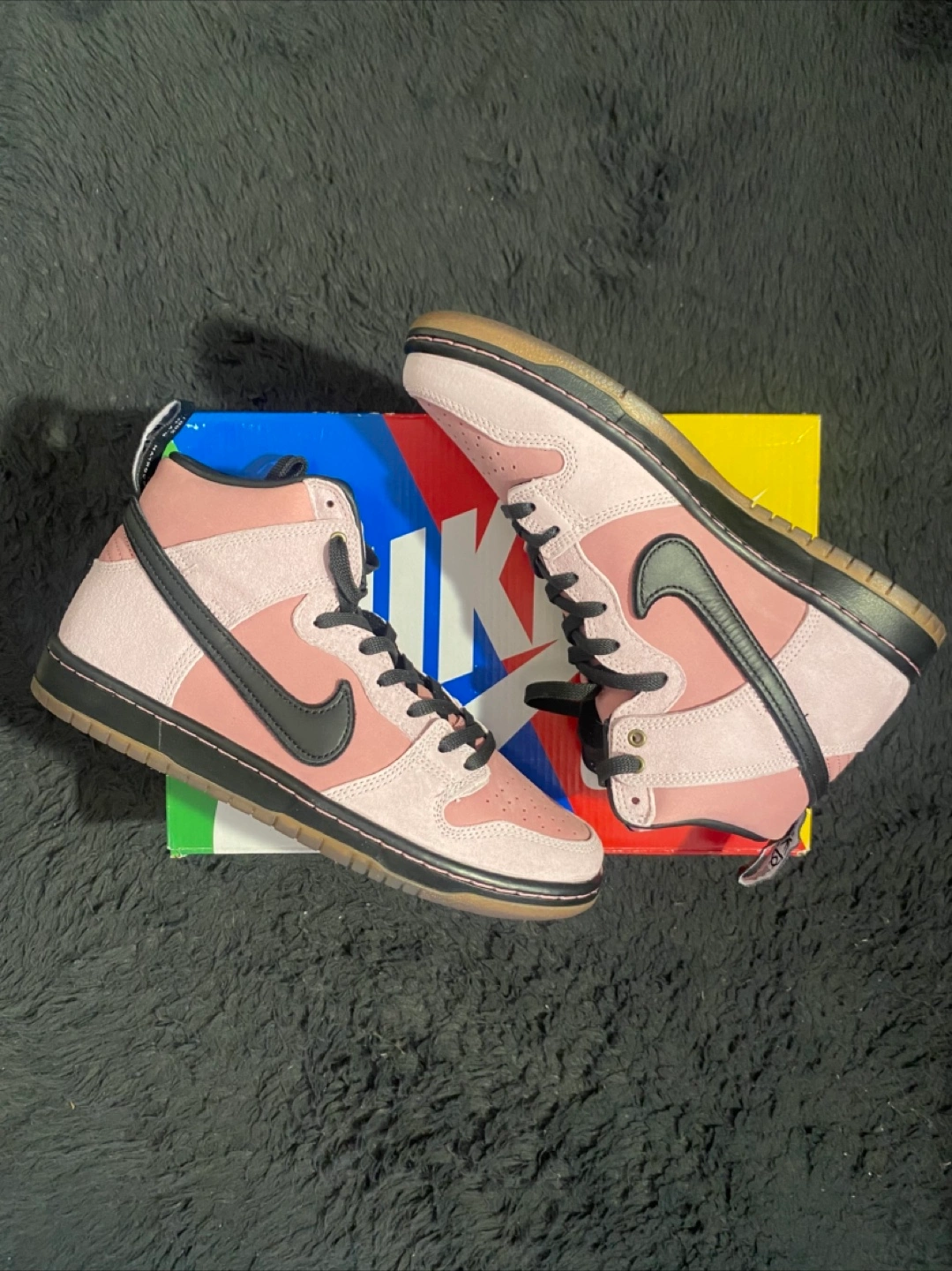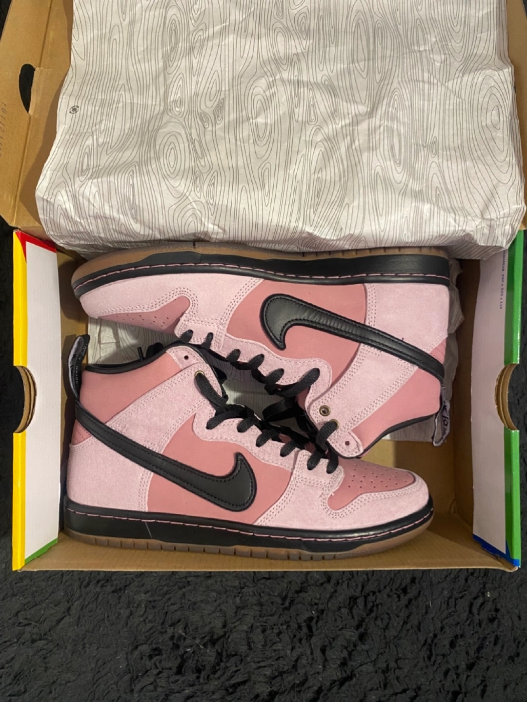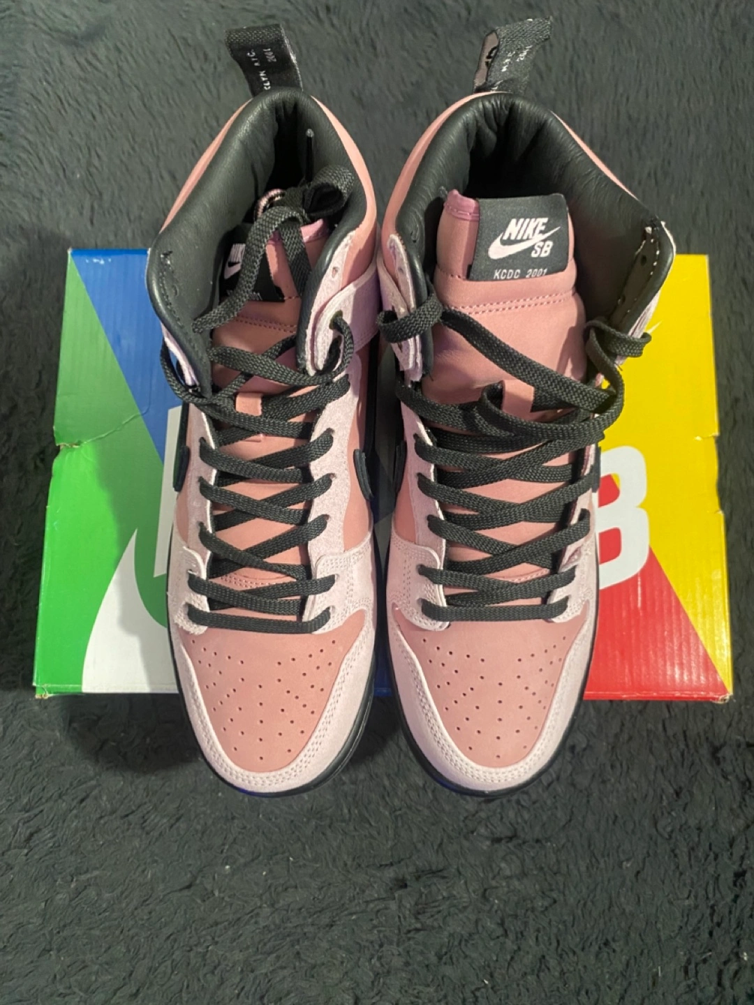 Selling a pair of Nike SB Dunk High KCDC 2022 sneakers in pink and black. They come with the original box