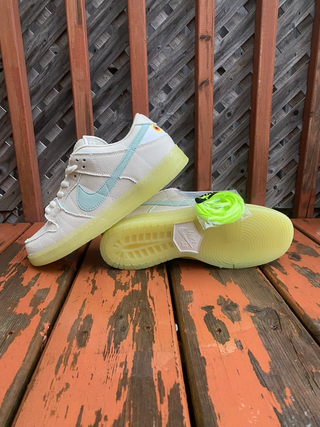 12BRAND NEW !!!!!!! Lowest price in market Only 1 left Size 9.5 Selling a pair of Nike SB Dunk Low 'Mummy' sneakers in size 9.5 US. These have a unique design and are in great condition! They feature a light beige color with light blue accents and a glow-in-the-dark sole. Comes with extra laces!