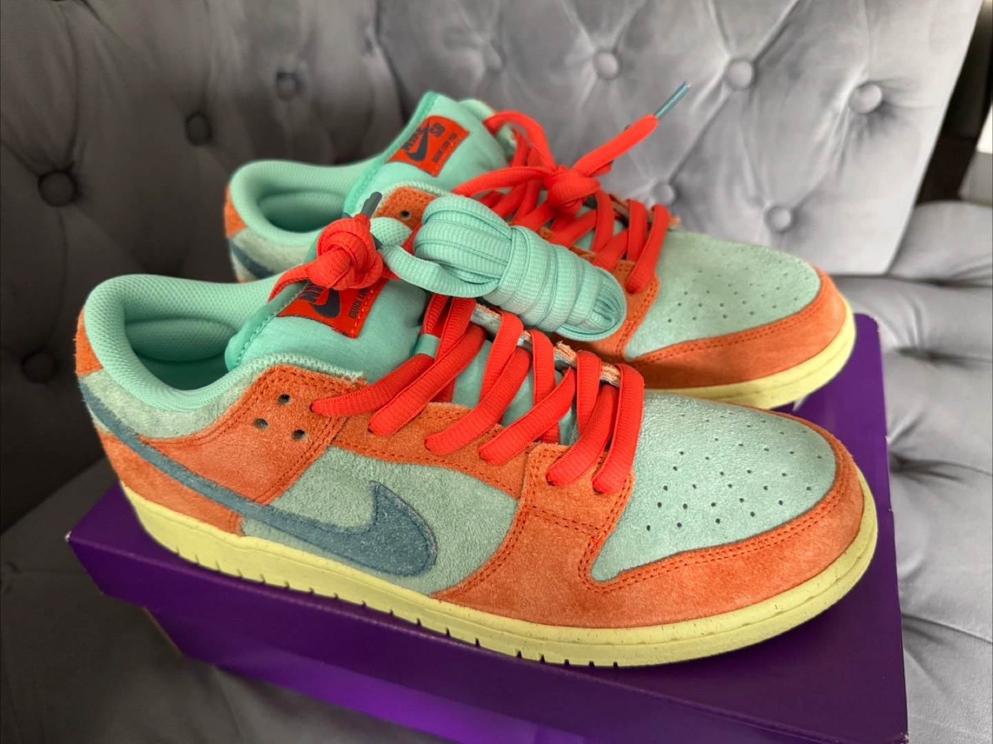 Selling a pair of Nike SB Dunk Low pro orange/noise aqua-emerald rise sneakers! These come with the original box. A stylish addition to any sneaker collection!