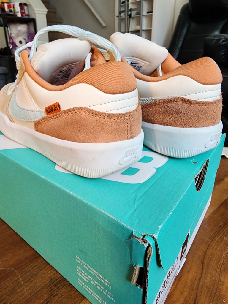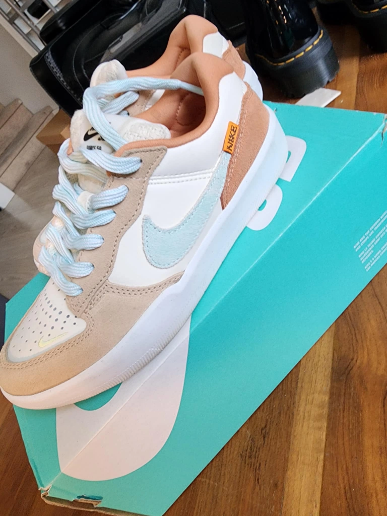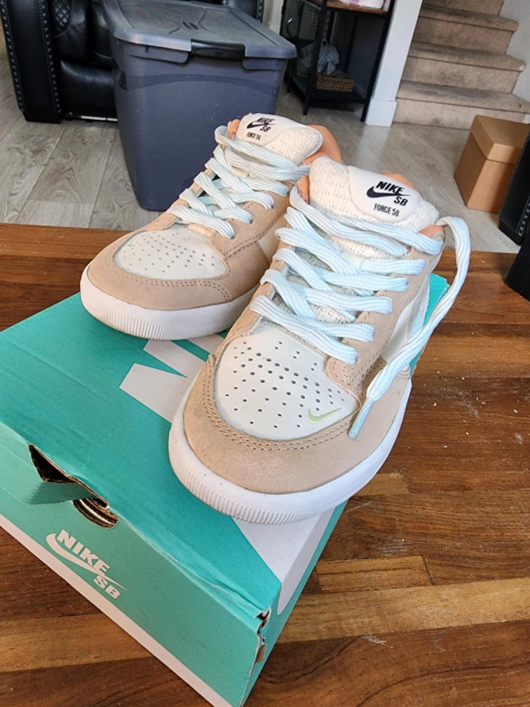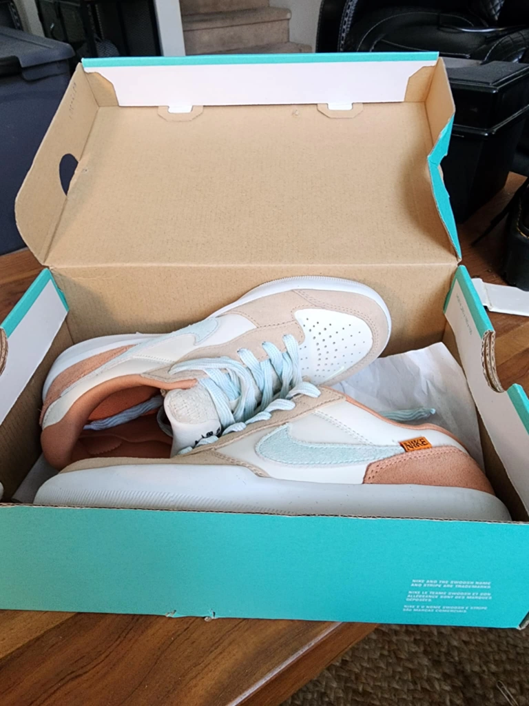 Fresh pair of shoes, appears unworn. Features a low-top design. Light blue laces. White soles. They would make a great gift to bring joy to someone's day.