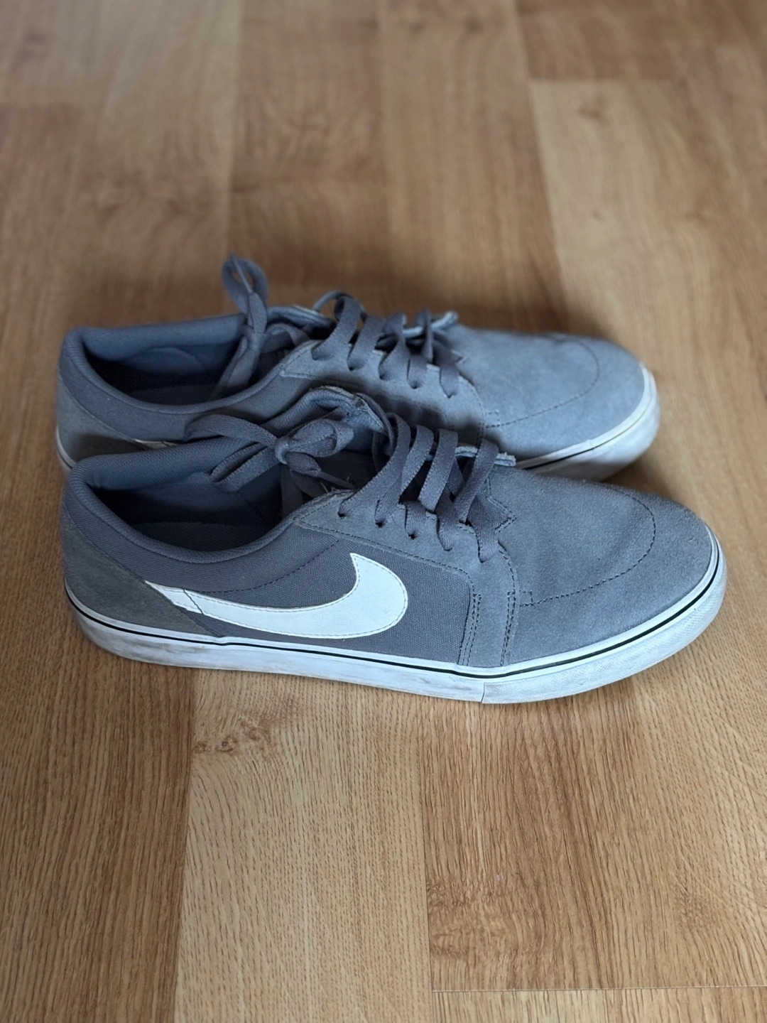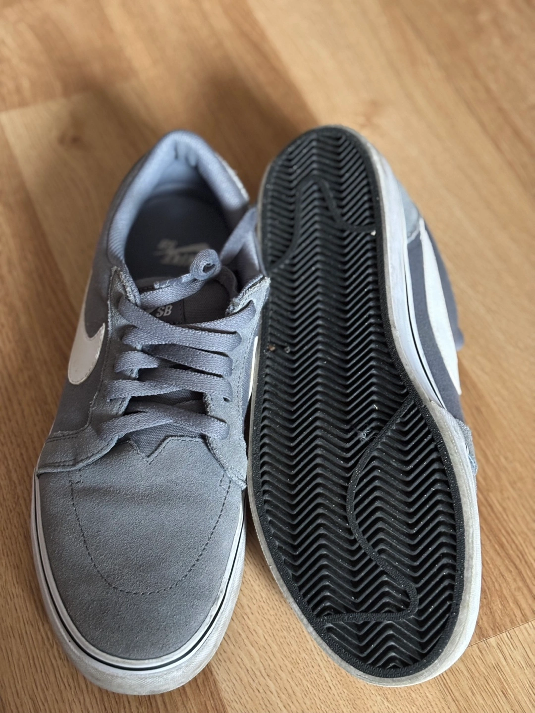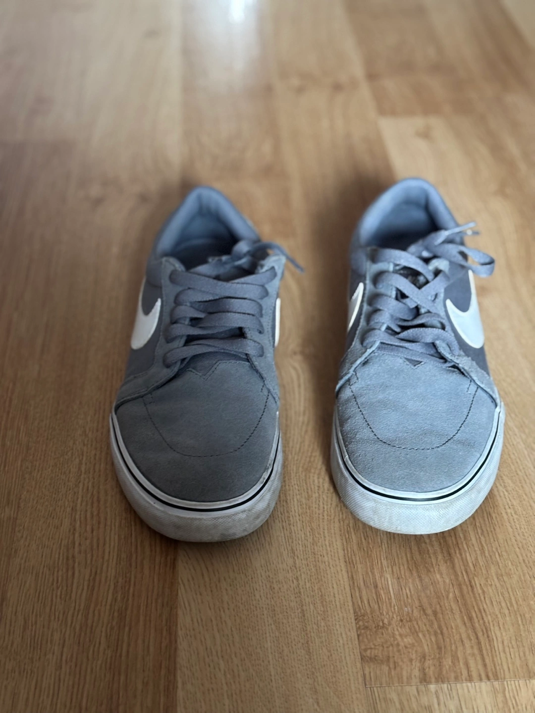 26Grey suede Nike SB Portmore II skate shoes. Low-top design. White swoosh logo. Grey laces. Worn a couple of times.