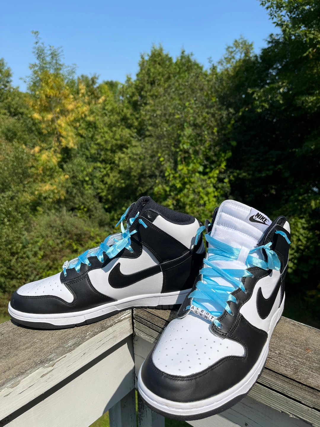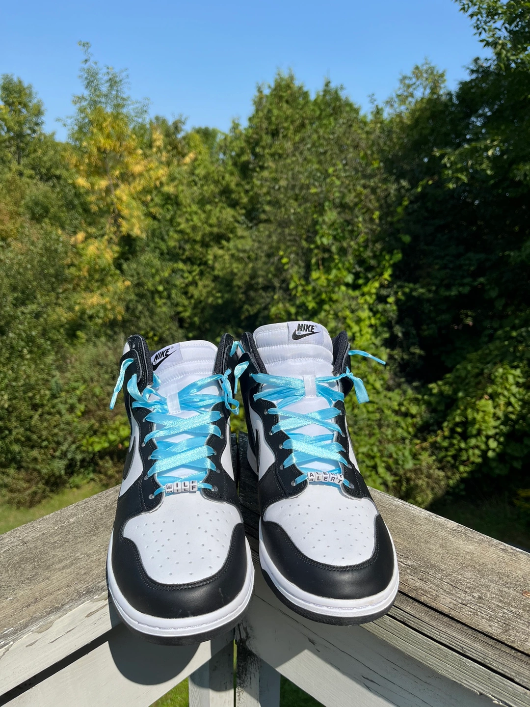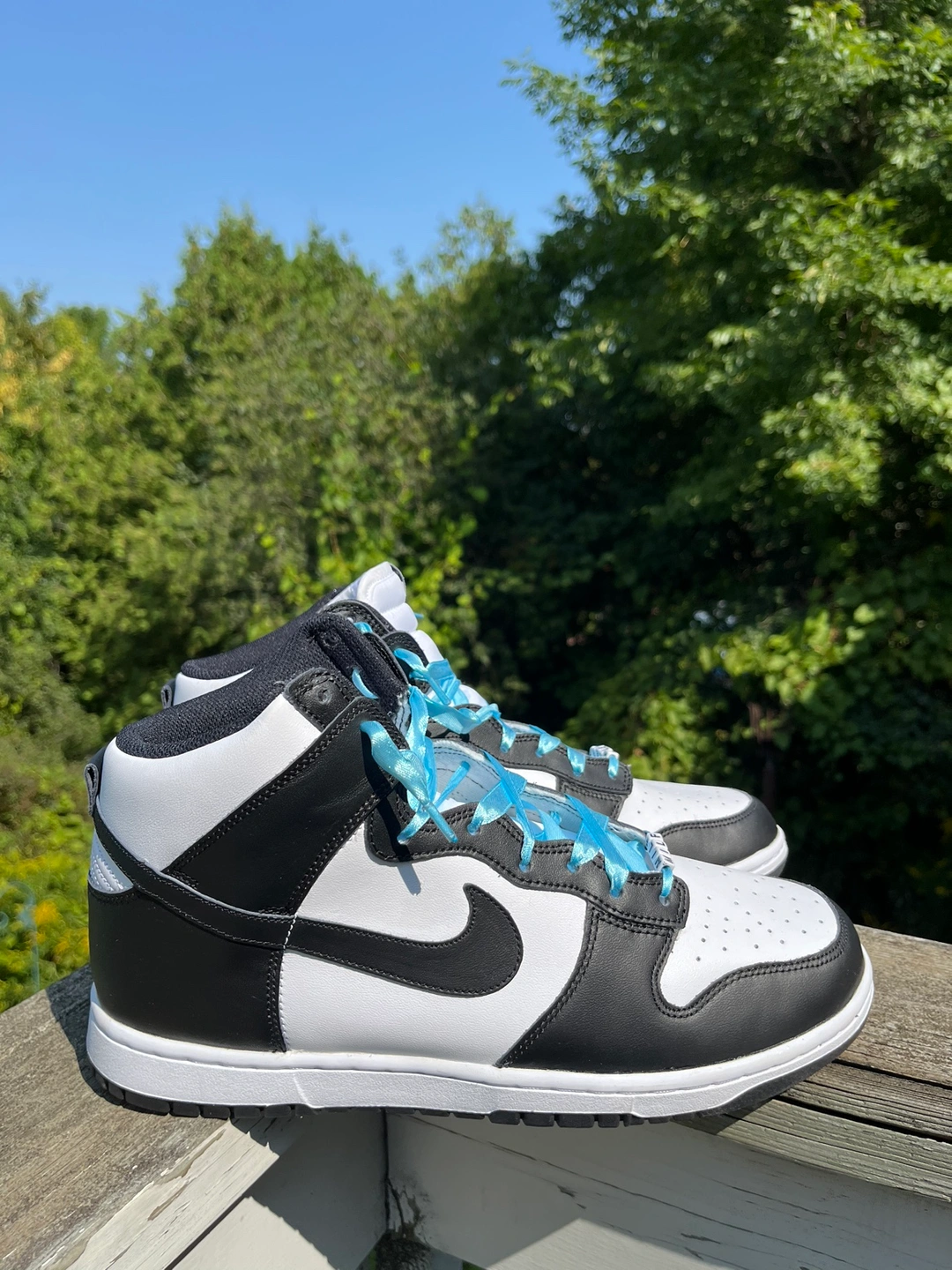 Nike Dunk High Retro White and Black (Men’s Size 11) lwith light blue laces and custom charms. Wore once. No box.