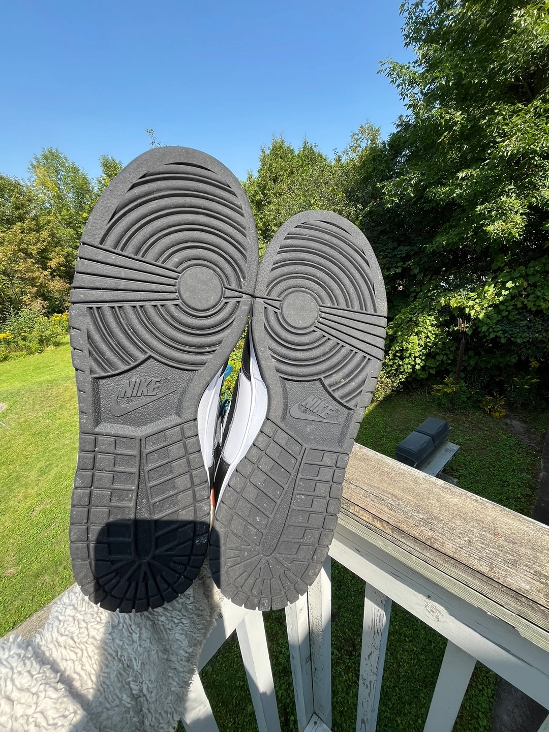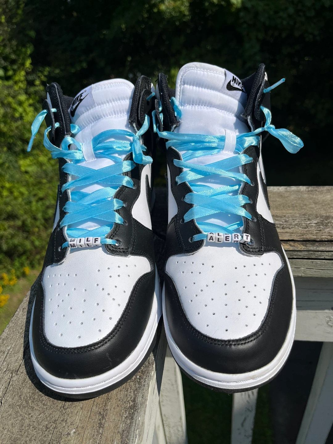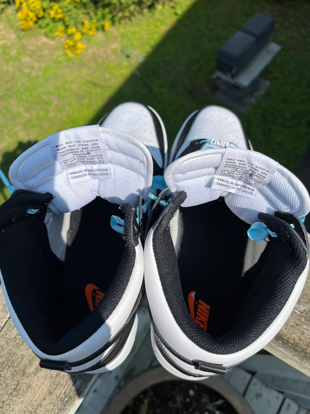 Nike Dunk High Retro White and Black (Men’s Size 11) lwith light blue laces and custom charms. Wore once. No box.