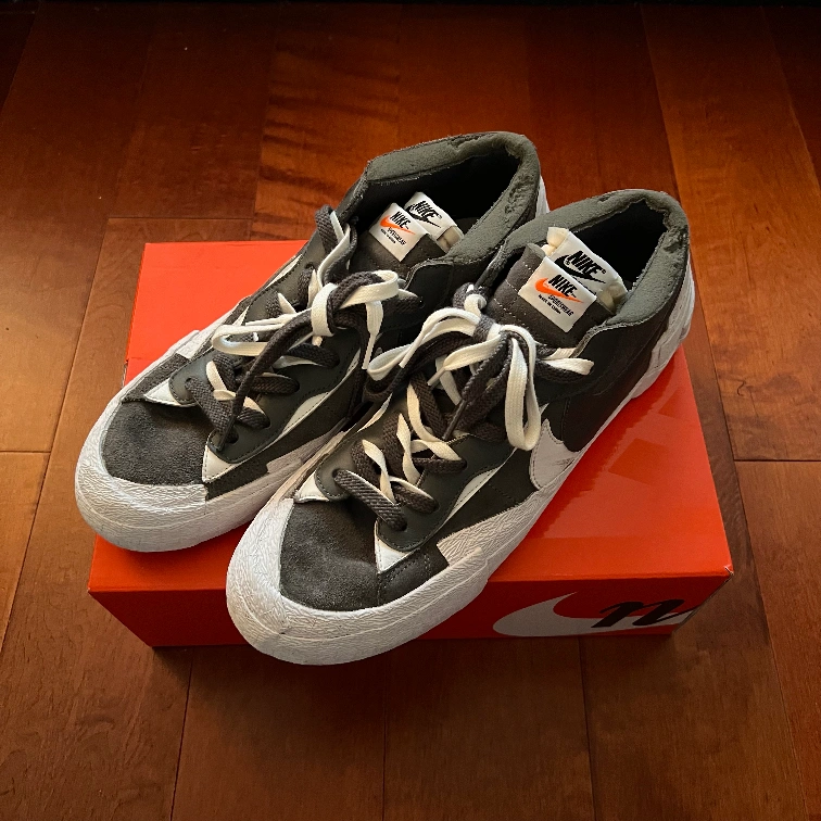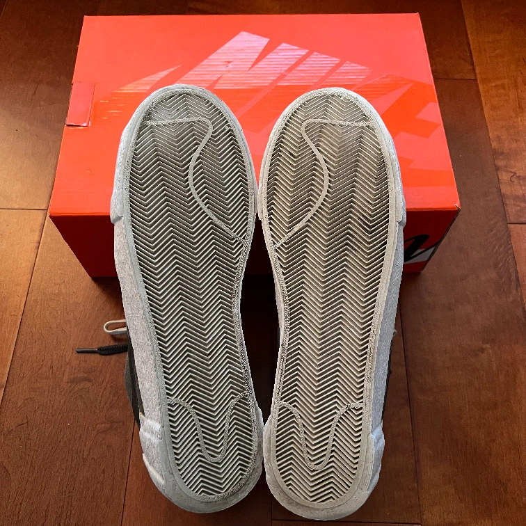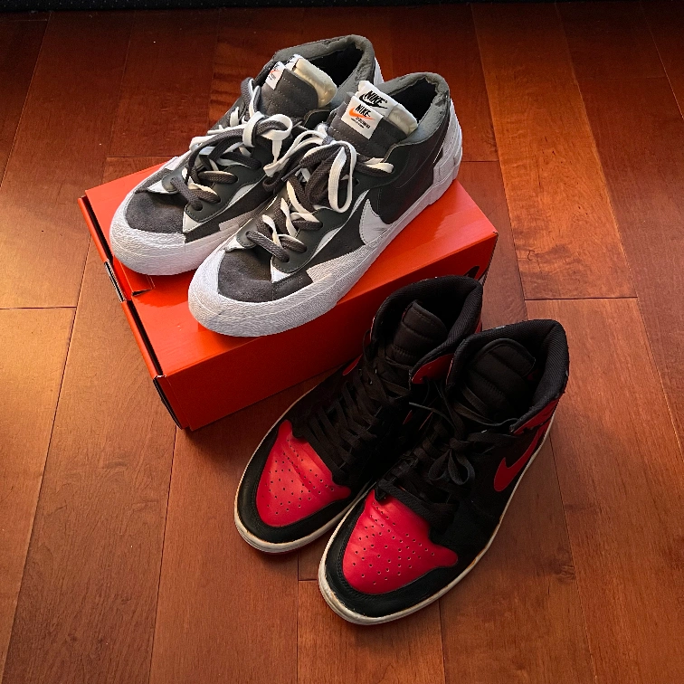 Nike Sacai Blazers Sz - 12 (fits 11 - 11.5 due to narrow shape) Colorway - Iron Grey / White Condition - Good (minor scuffs due to longboarding) Distressed look is part of the Sacai brand. Silhouette works better for taller builds, For shorter people (like myself) Recommended baggy pants to get the full effect of the shoe. Great for skate/longboard, grips well and feels comfy. Jordan 1 Mid Breds Sz - 11 (fits 10.5 comfy, 11.5 depending on foot width) Colorway - Black/Red Condition - Okay Custom painted 2015 Jordan 1 mids. Resolled with Jordan 1 high soles. DM for more details and individual pricing.