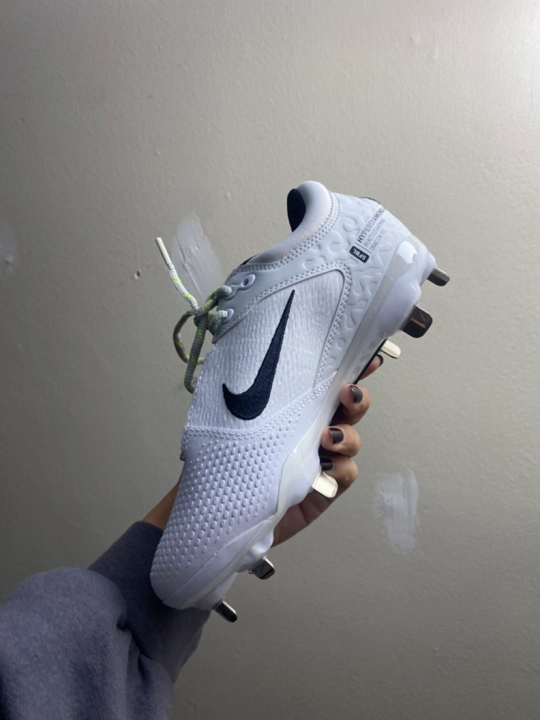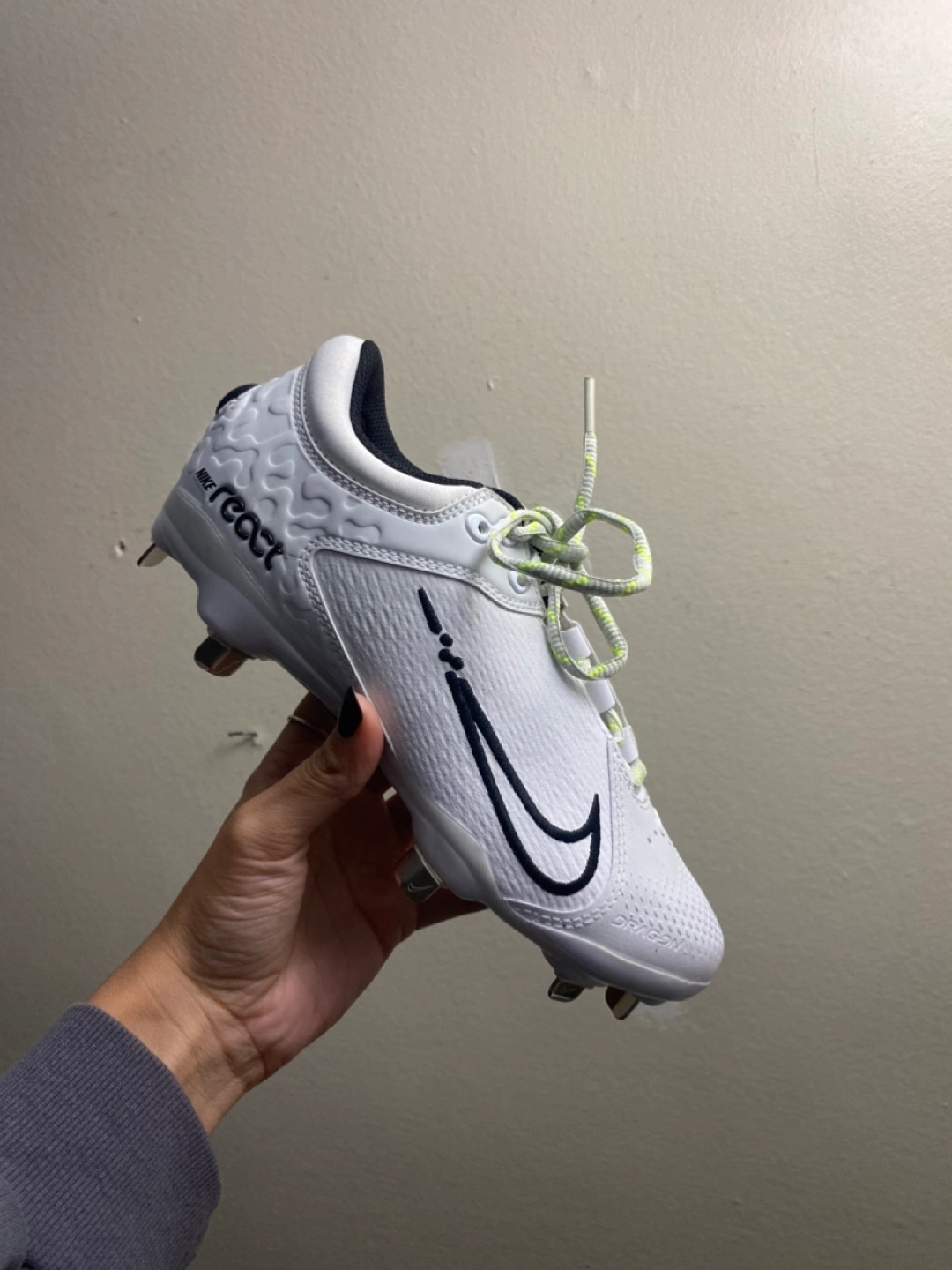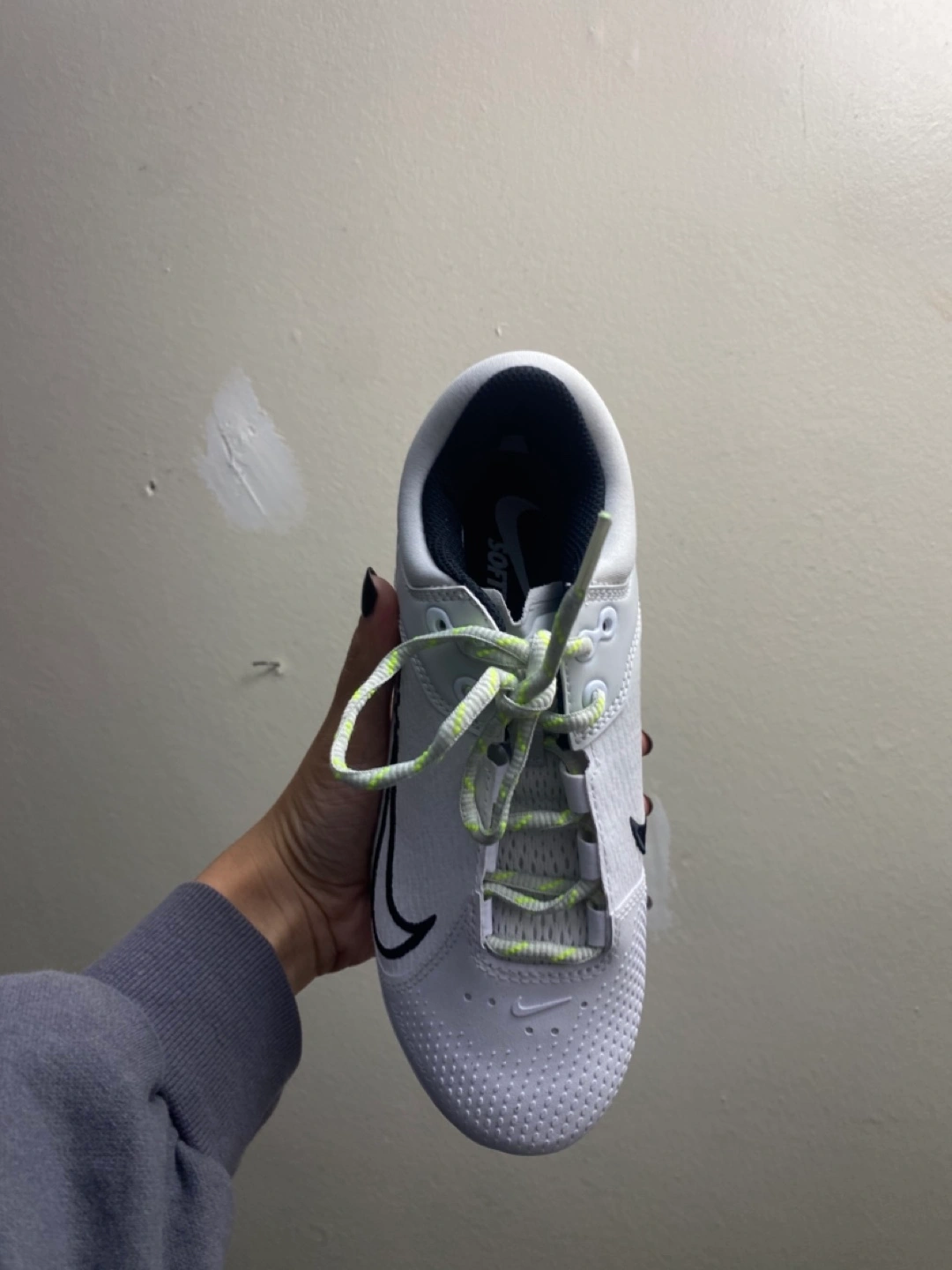 156White softball cleats with black accents and yellow laces. Size 5 Women’s brand new Pick up only