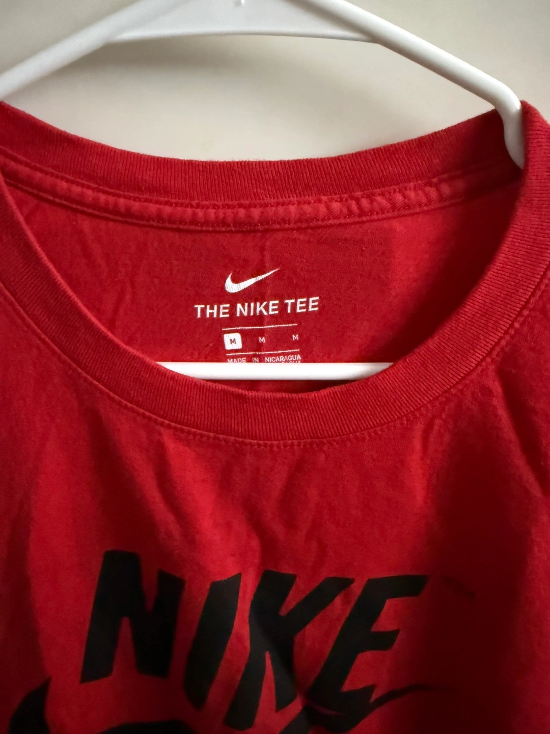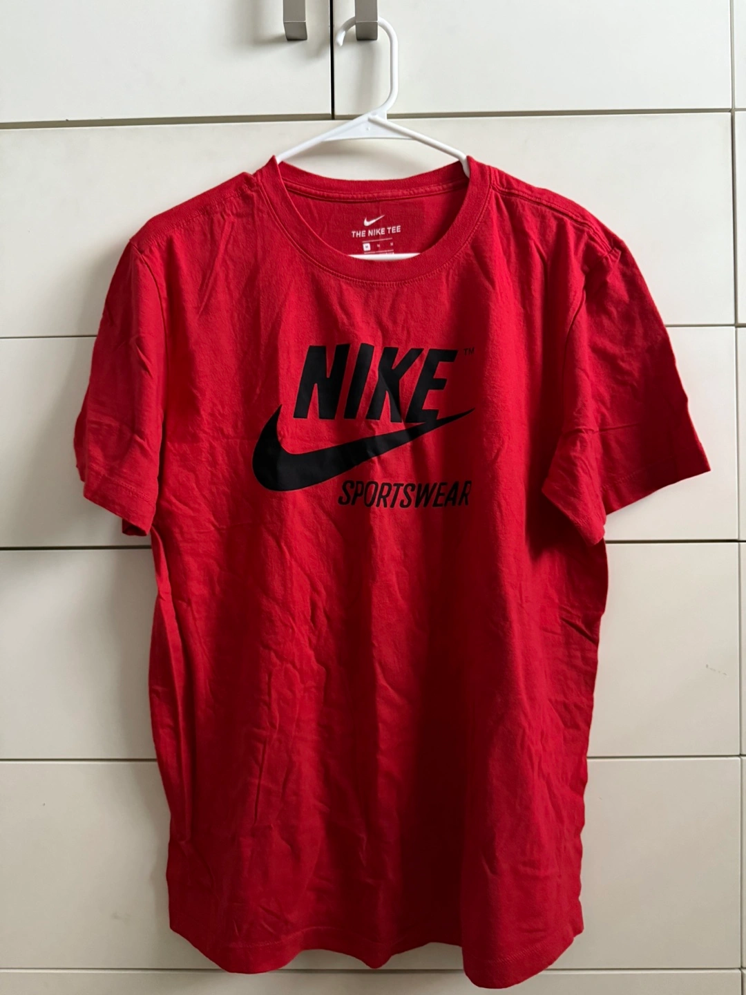 Selling a Nike Sportswear tee in red! It's a size medium and features the classic Nike swoosh logo. Great for casual wear or sports activities