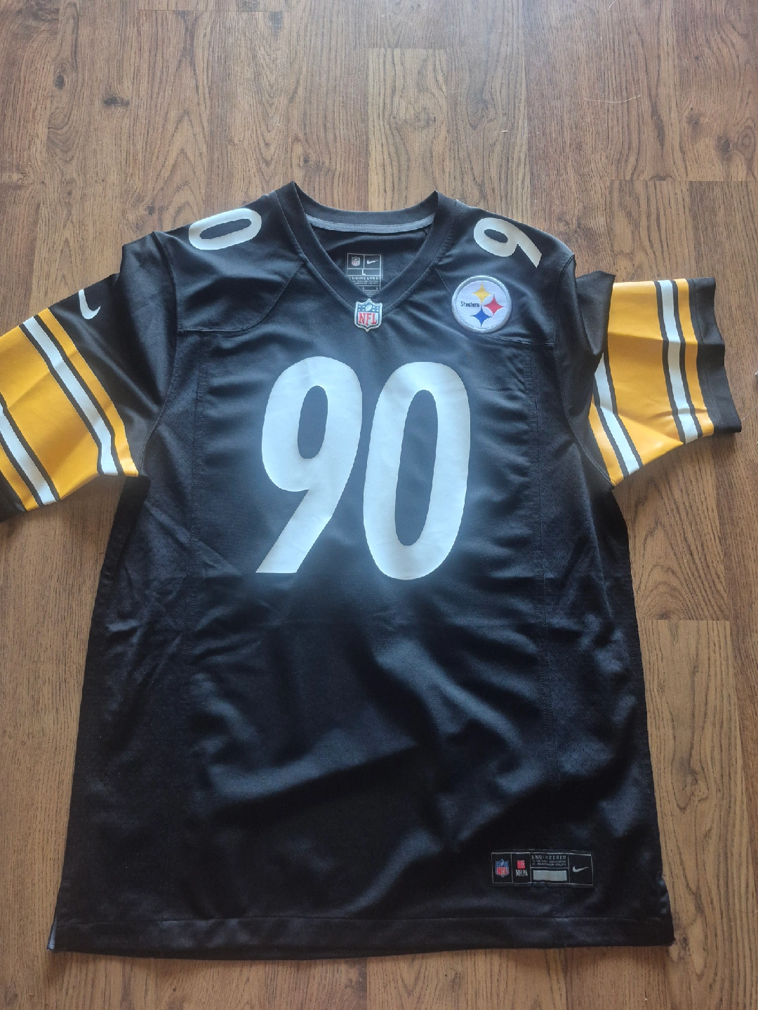 10Selling a Nike Steelers jersey, featuring Watt #90! It's a men's size large. The tag shows a suggested retail price of CAD $170.00. Asking $150