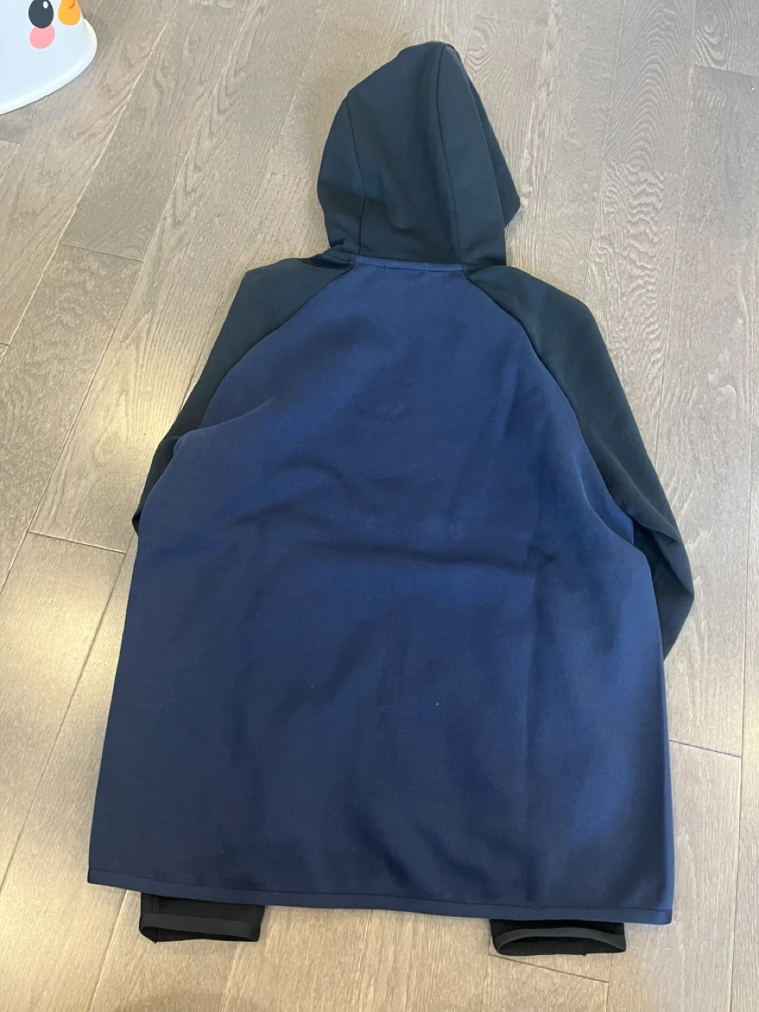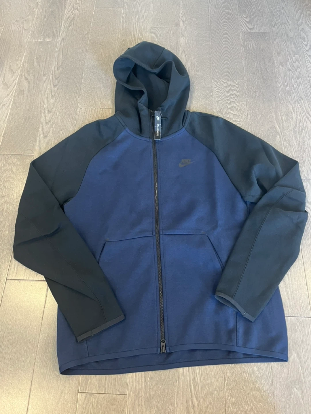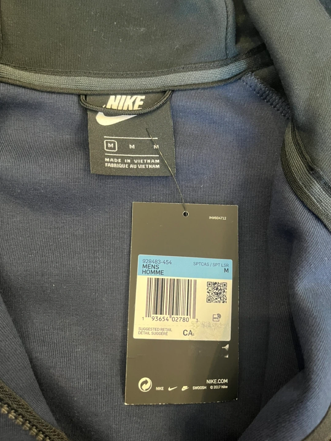Selling a Nike Tech Fleece hoodie in a nice blue and black colourway. It's a size medium. The suggested retail price on the tag is in Canadian dollars. Great for staying warm and stylish!