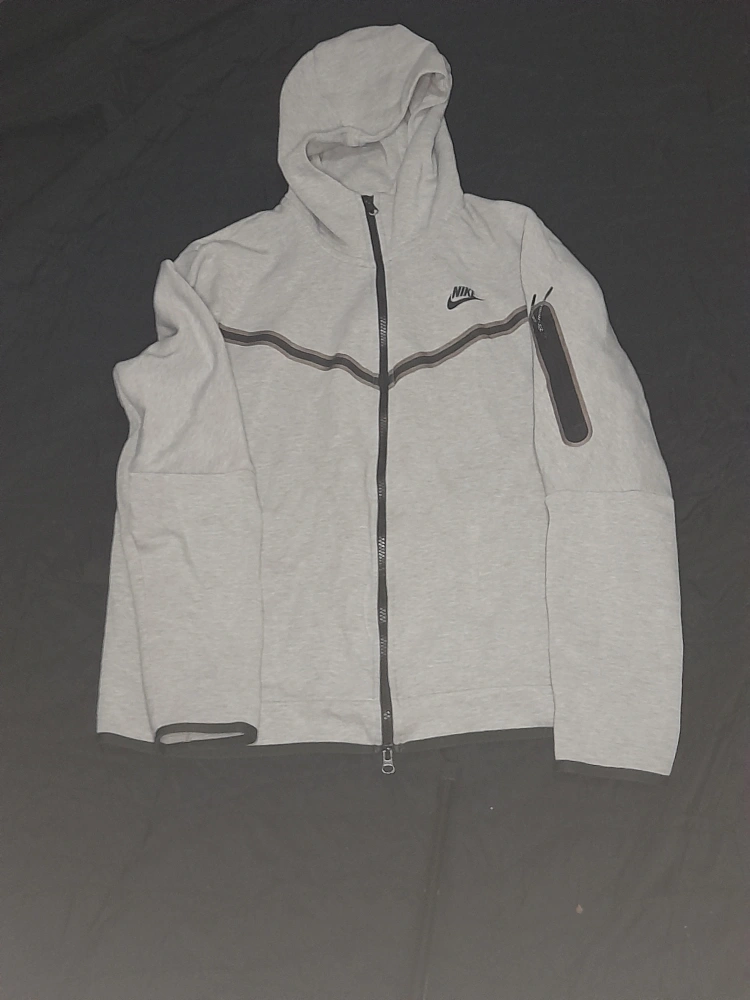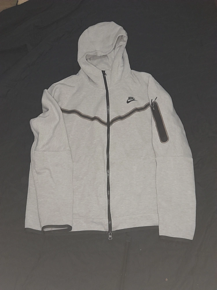Selling a Nike Tech Fleece hoodie in grey. It's in great condition and perfect for layering or wearing on its own. The tech fleece material is lightweight and comfortable, making it ideal for everyday wear. It features a full zip, a hood, and a zippered pocket on the sleeve. A stylish and practical addition to your wardrobe!