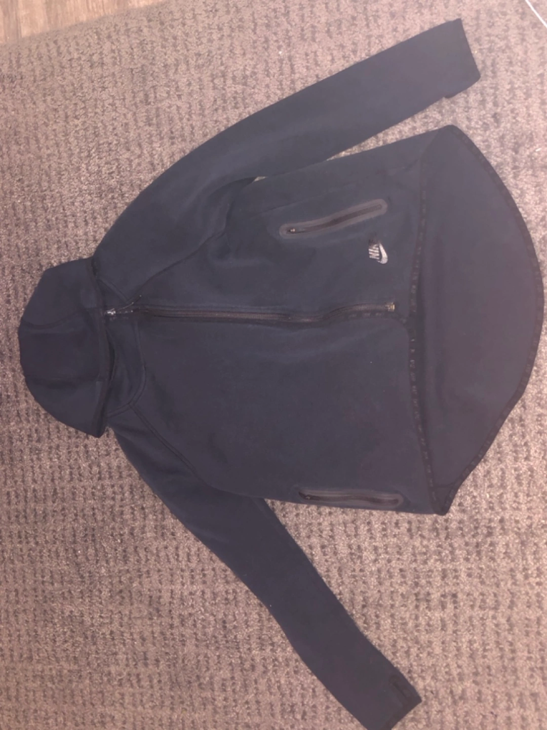Nike Tech Fleece zip-up hoodie. Small size. Black colour. Features a hood and pockets. Slightly cropped length.