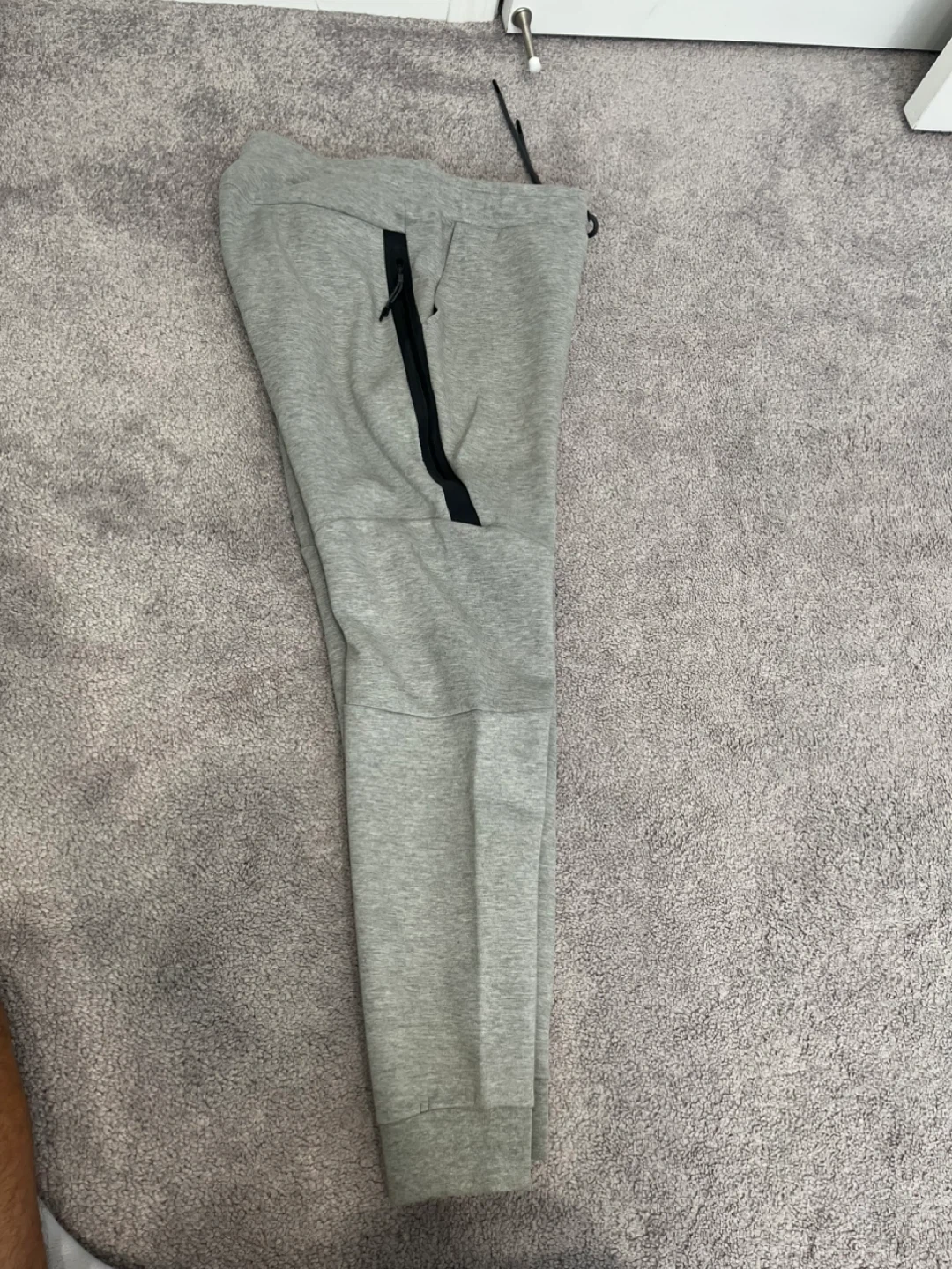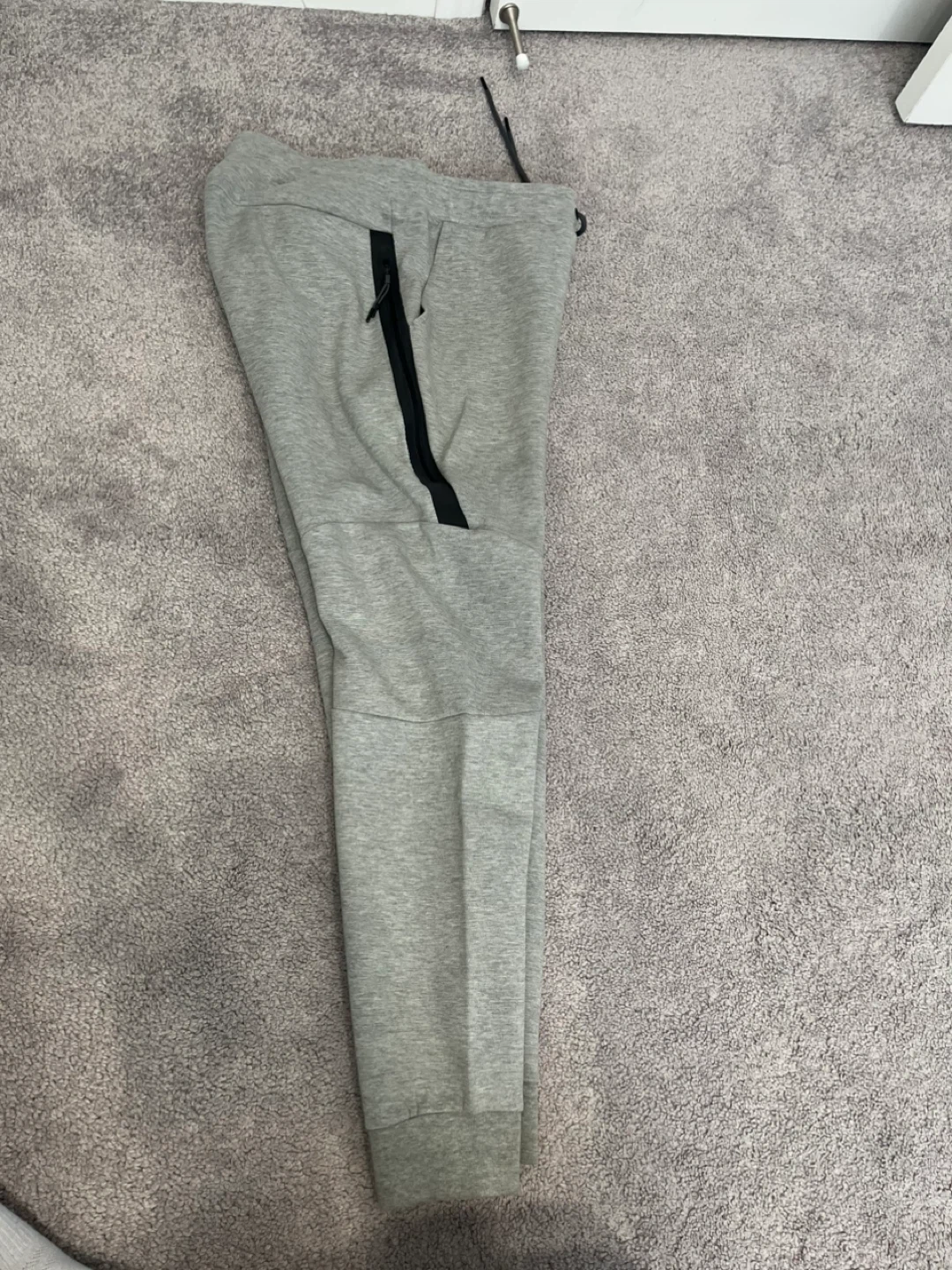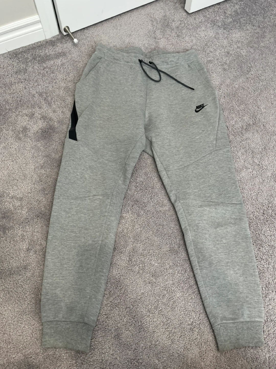 Selling a pair of Nike Tech Fleece pants in a light grey colour! They're a size medium and in great condition. Made with a comfortable blend of 66% cotton and 34% polyester, perfect for everyday wear