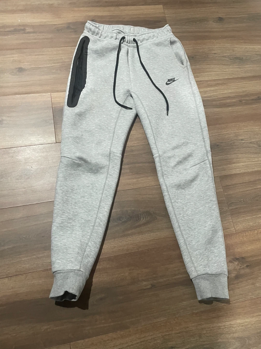 Cozy and stylish Nike Tech Fleece pants in size small men’s. The zipper is out for the side pocket but I still have the zip just can’t put it back on if ur able to do so it’ll work! grey joggers feature a comfortable fit and a sleek design, perfect for workouts or just lounging around.