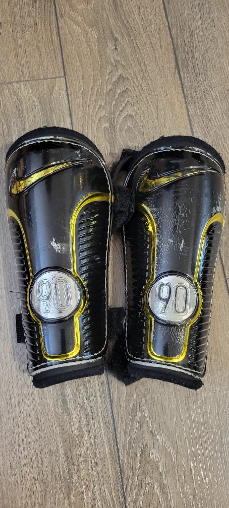 70Selling a pair of Nike Total 90 shin guards. They are black with gold accents and have the number 90 on the front. They show some signs of wear.