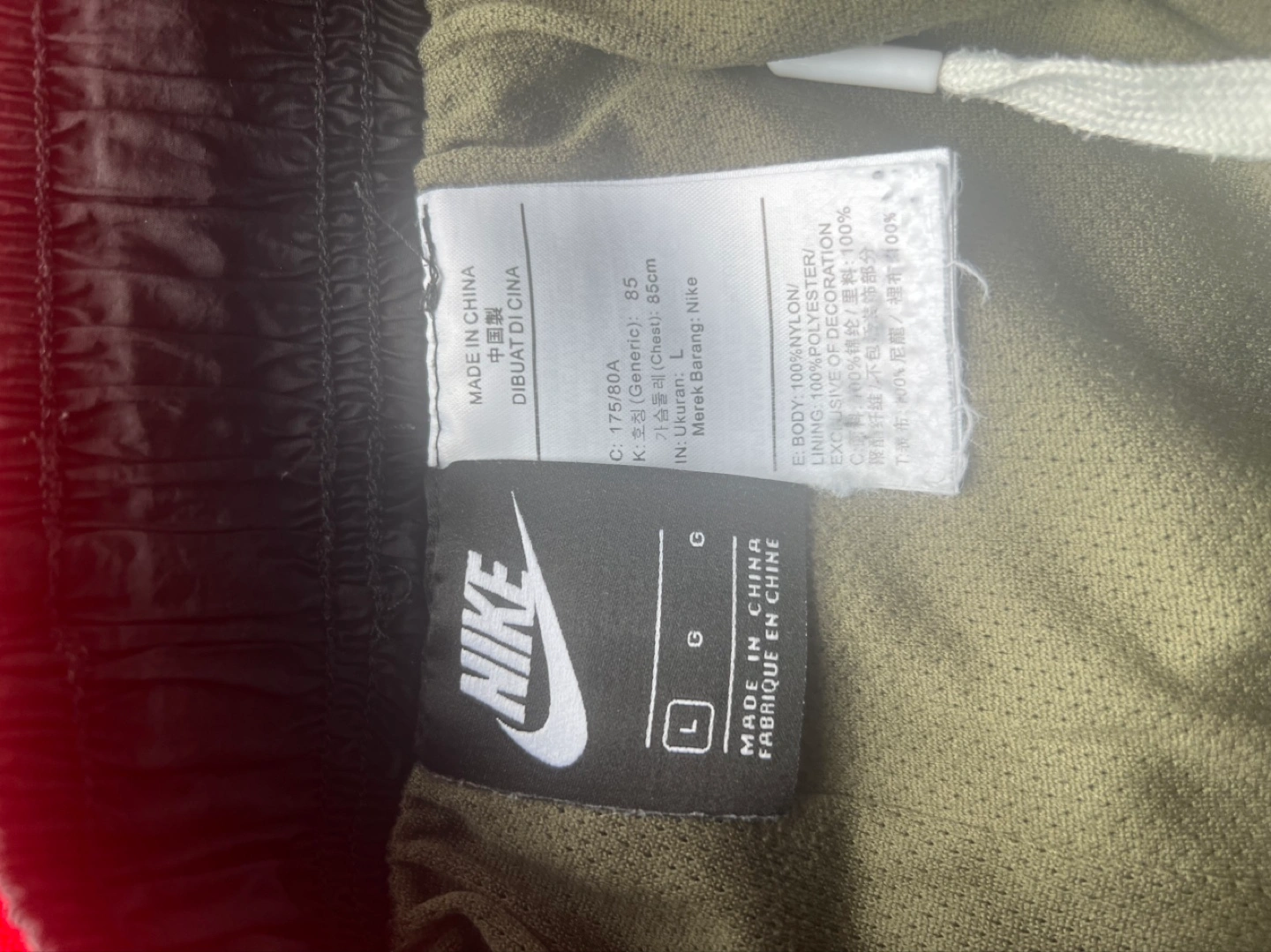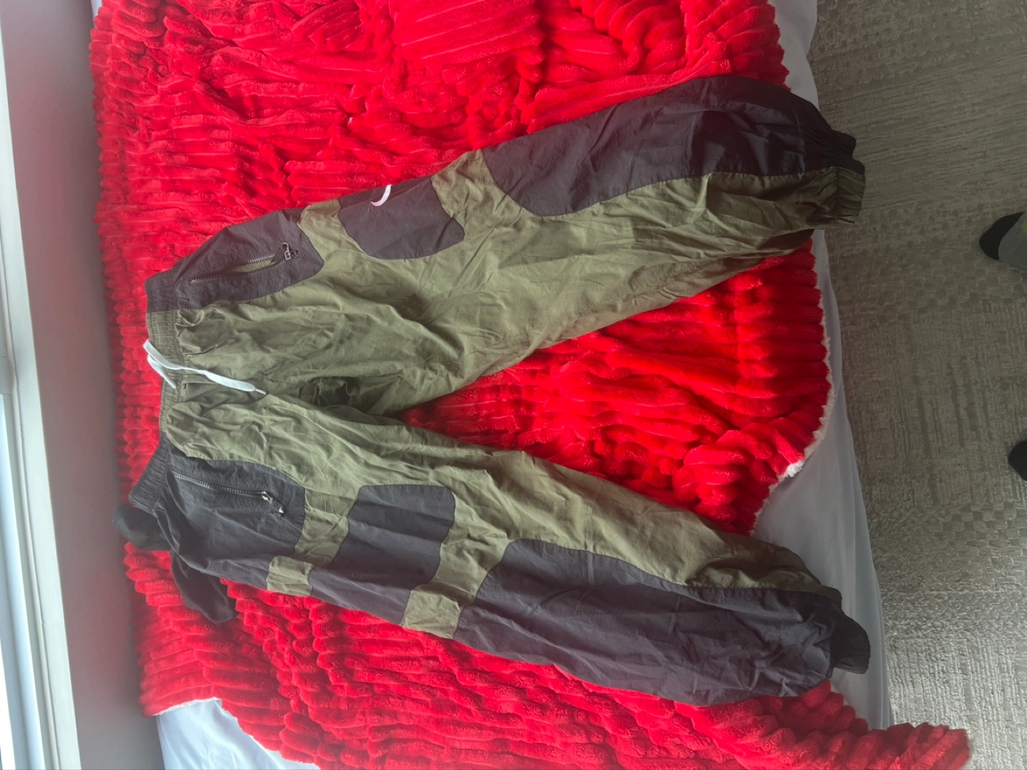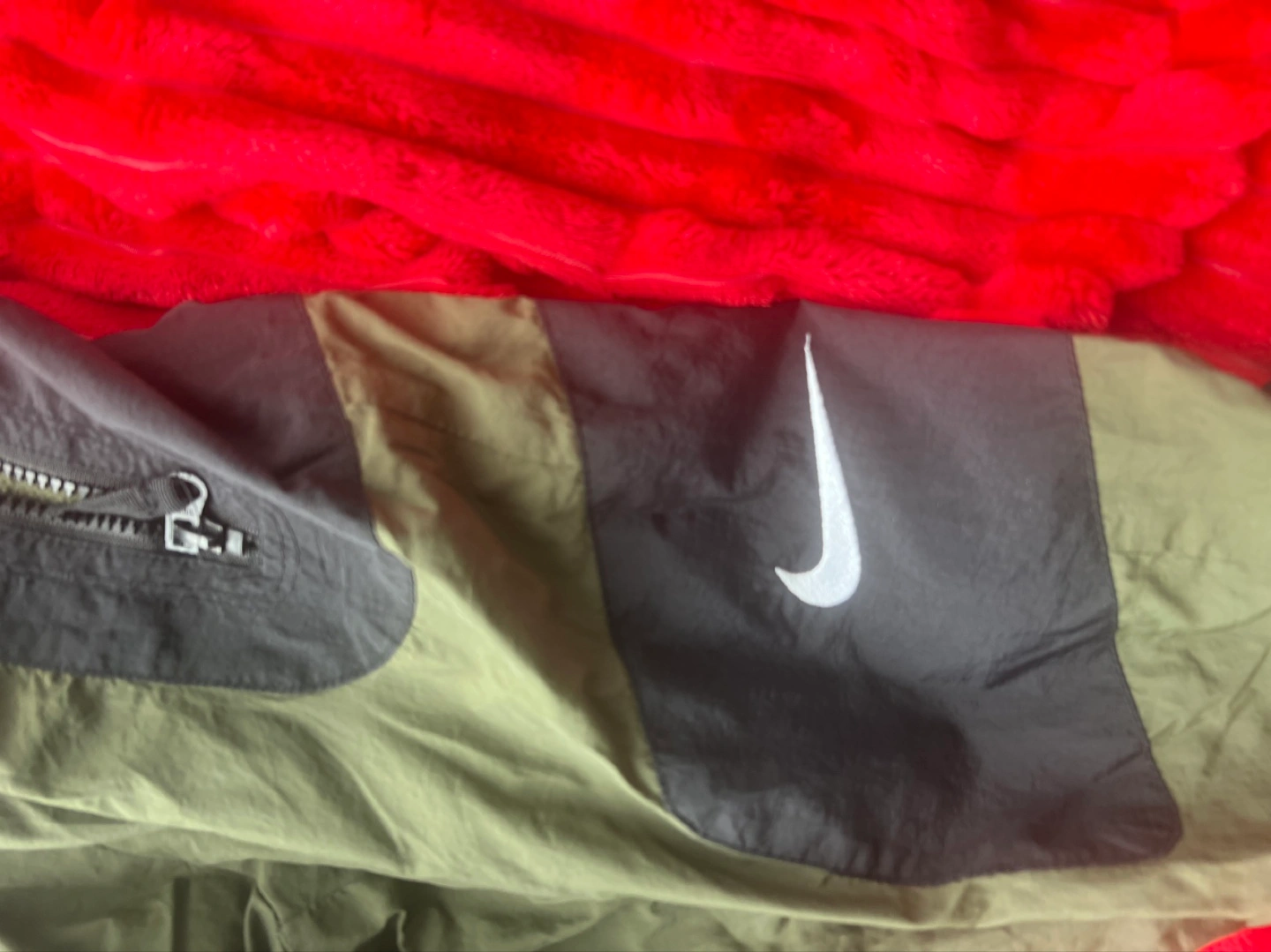 82Olive green and black Nike track pants. Size large. Features zippered pockets and drawstring waist. Made in China.