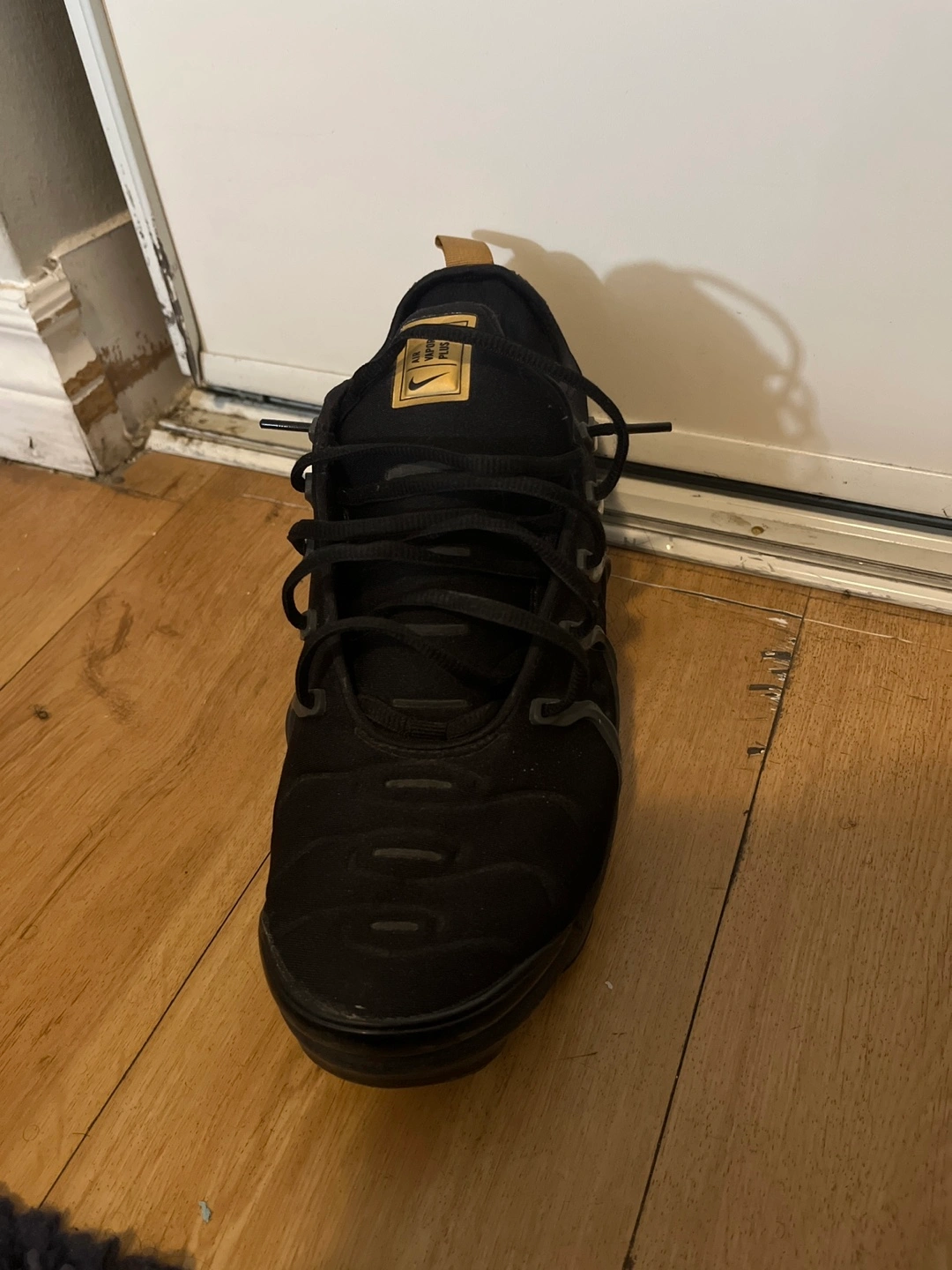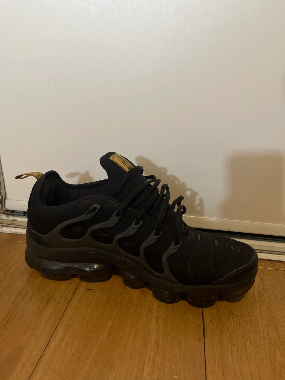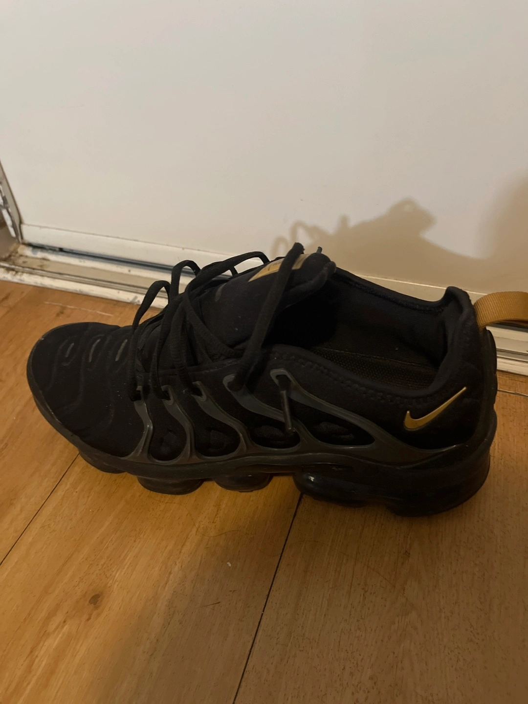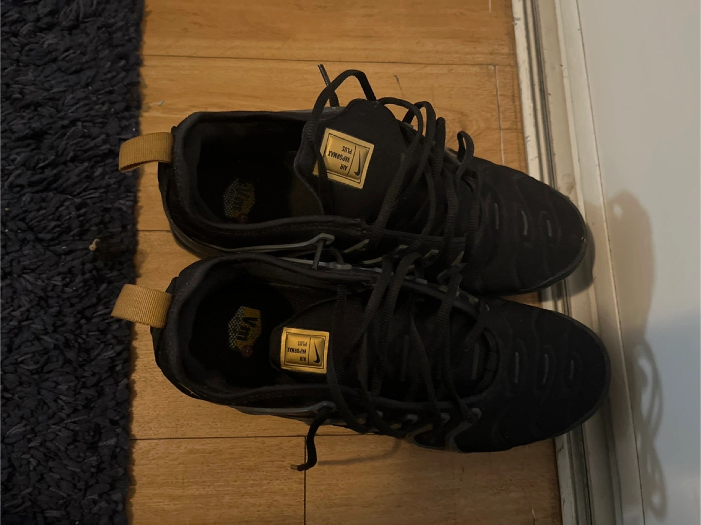 Men's Nike Vapormax Plus running shoes. Black with gold accents. Good condition, minimal wear.