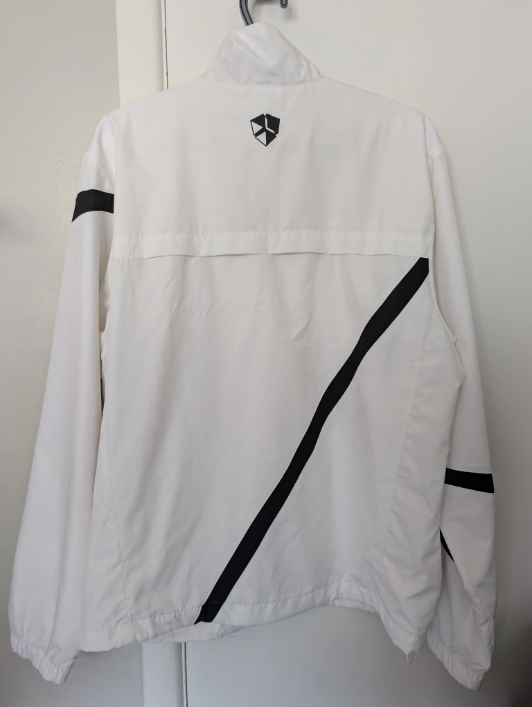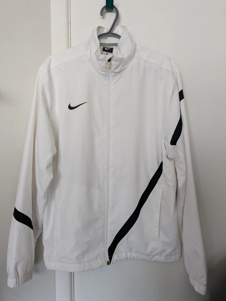 Selling a Nike track jacket in great condition! It's a clean white colour with black accents. The size is M. Perfect for workouts or casual wear!