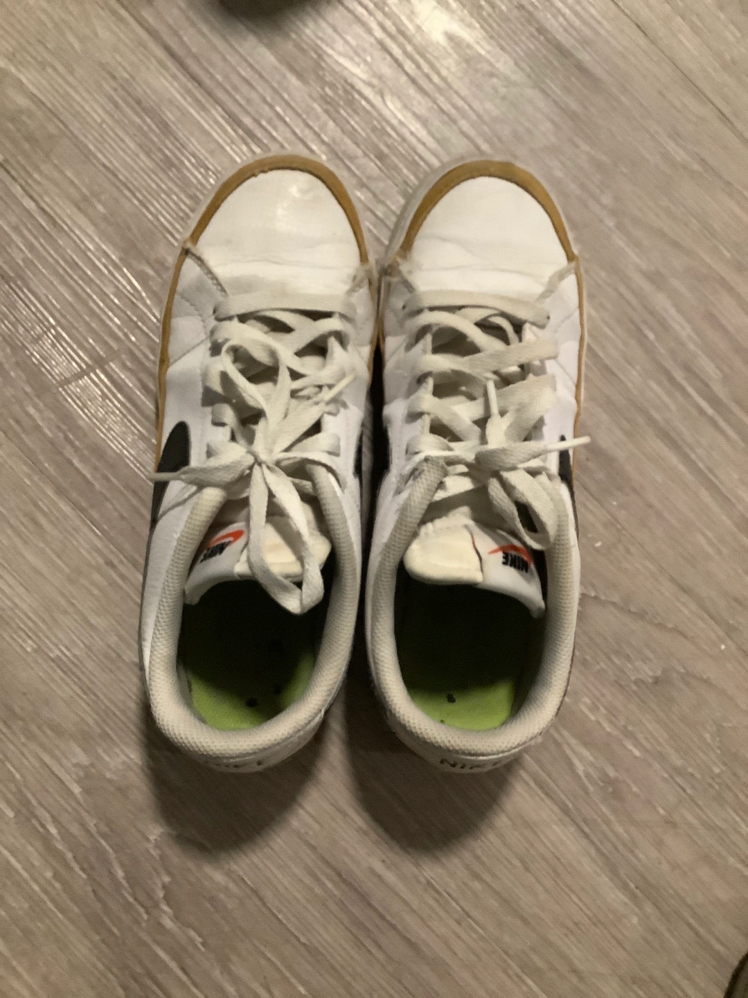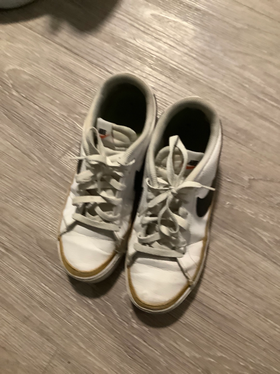 5Selling a pair of Nike sneakers. They are white with a black swoosh. Please see photos for condition.