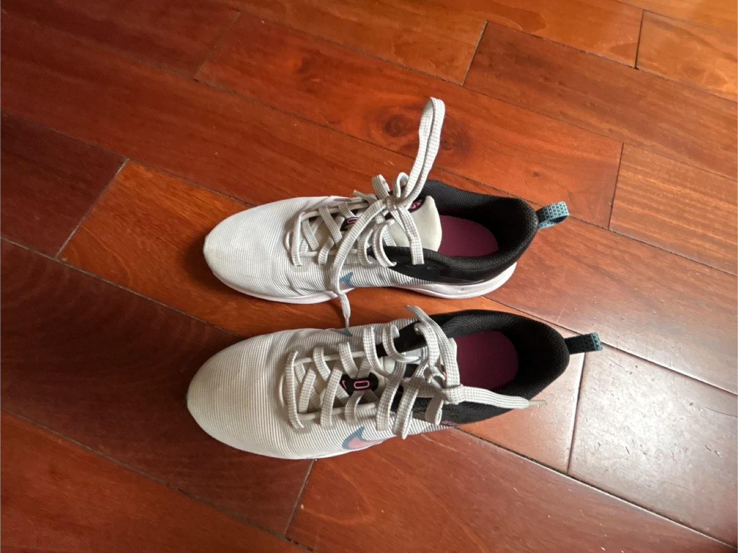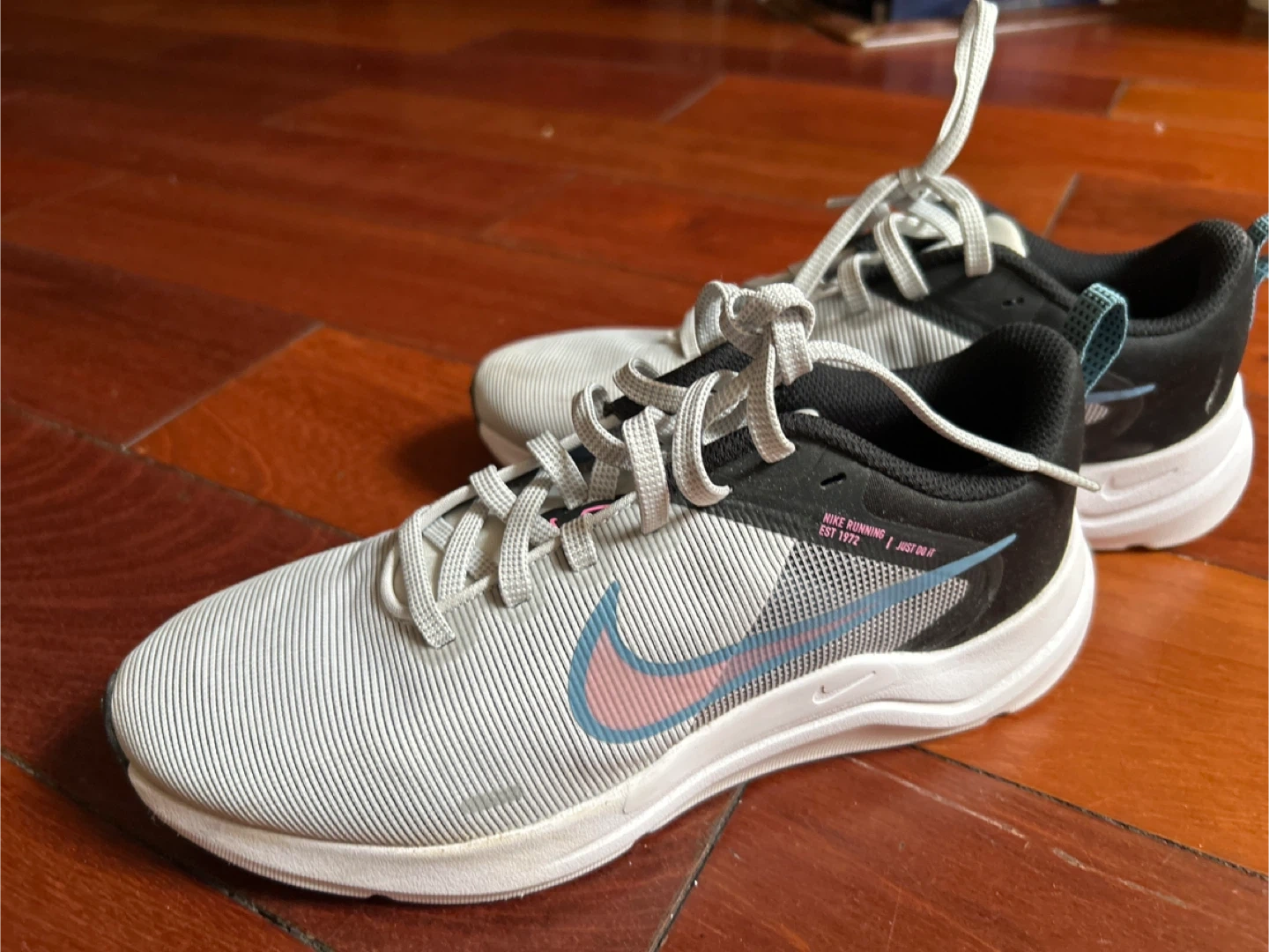 Selling a pair of Nike Downshifter 12 women's running shoes in size 7.5 They feature a light grey and black colour scheme with a pink swoosh. These shoes are perfect for running or everyday wear!