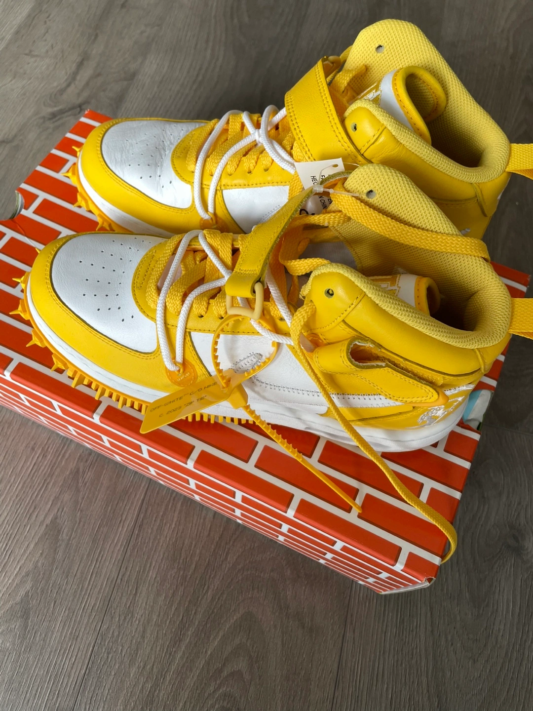 Selling a pair of Nike x Off-White Air Force 1 Mid sneakers in yellow and white. These shoes are in excellent condition and come with the original box. A stylish and unique addition to any sneaker collection!