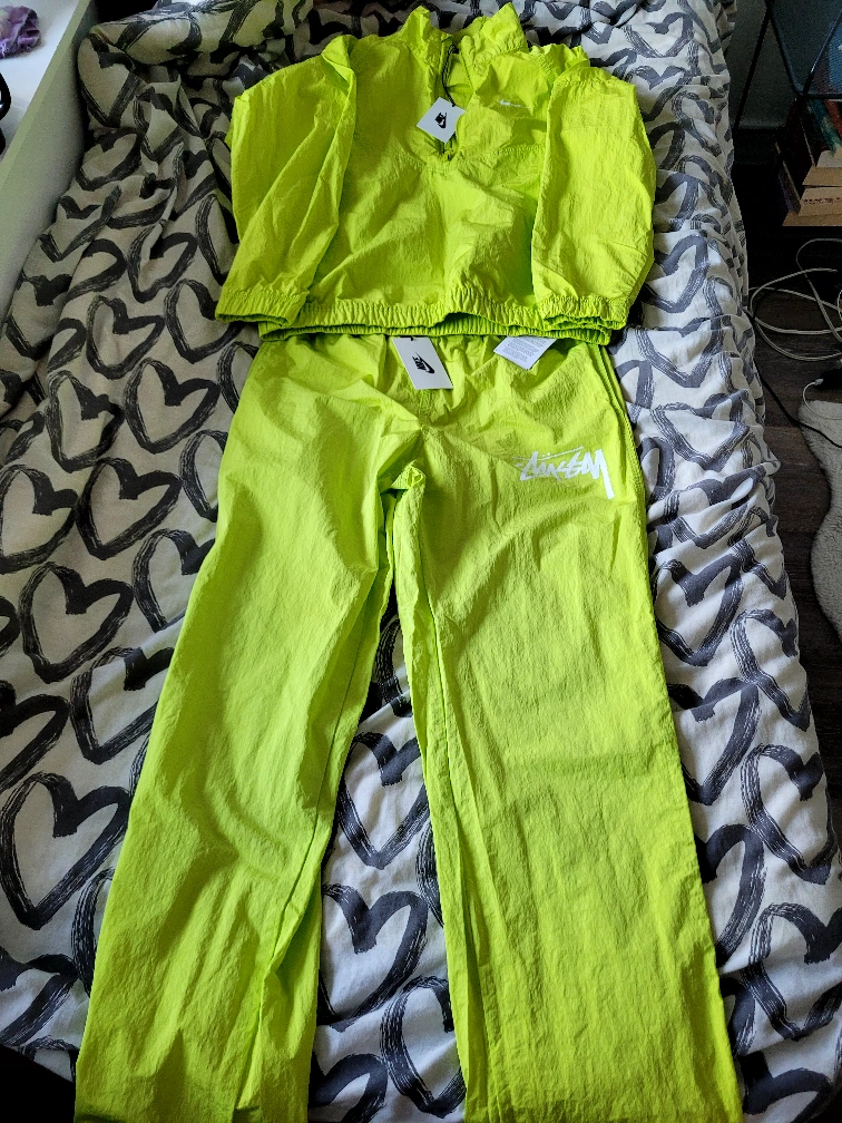 Brand new Nike x Stussy tracksuit with tags still attached! This vibrant green tracksuit is a stylish and comfortable addition to your wardrobe. It features both the Nike and Stussy logos. Perfect for casual wear or workouts!