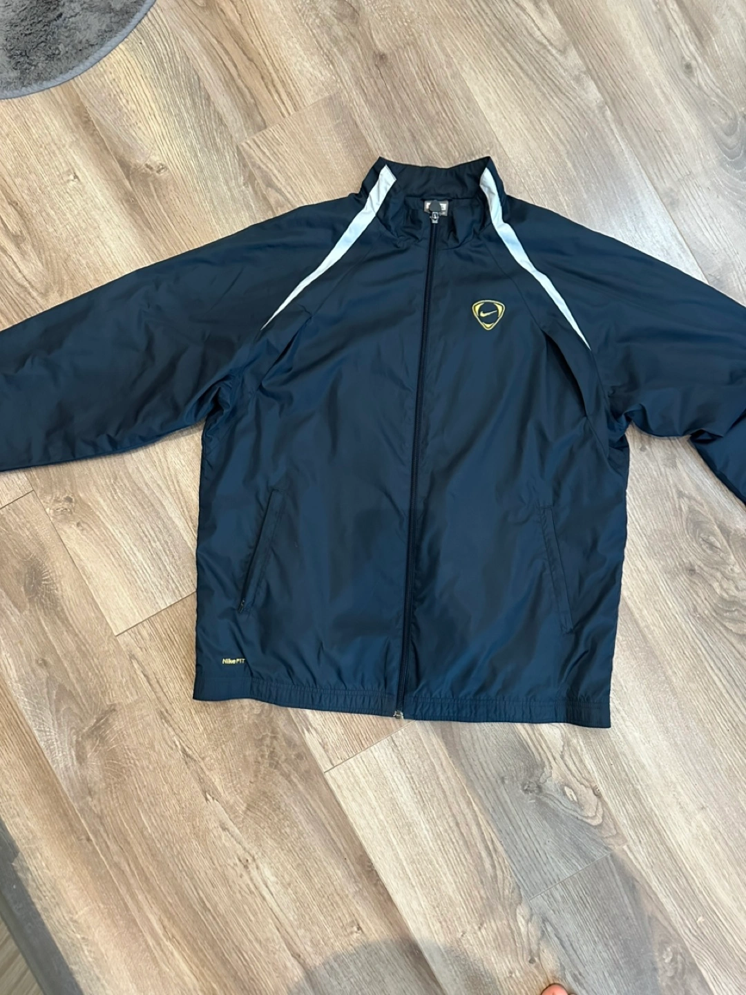 Navy blue jacket, with a zipper front closure. White accents on the shoulders, with two front pockets. A great option for a brisk walk on a cool day.