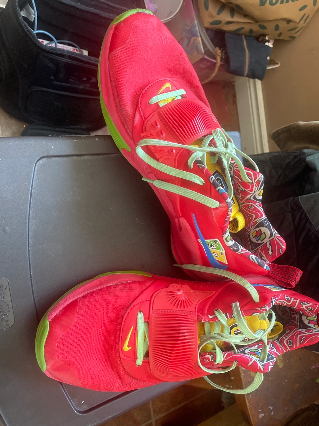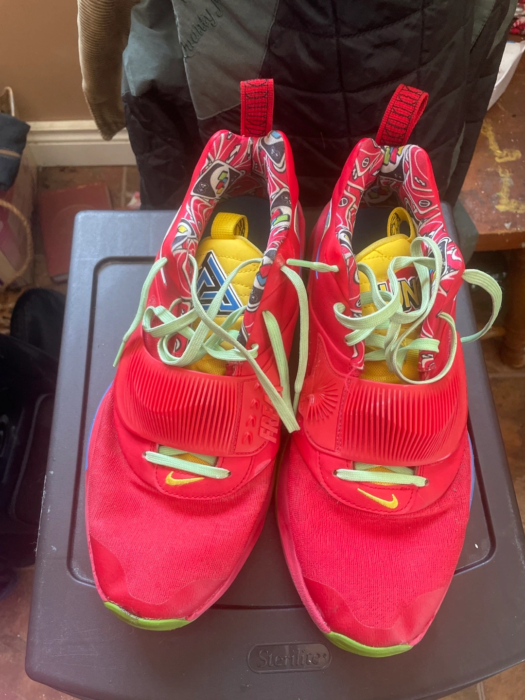 Pair of red Nike Zoom KD IV basketball shoes. Size 10. Yellow accents and unique graphic inner lining. Pre-owned condition.