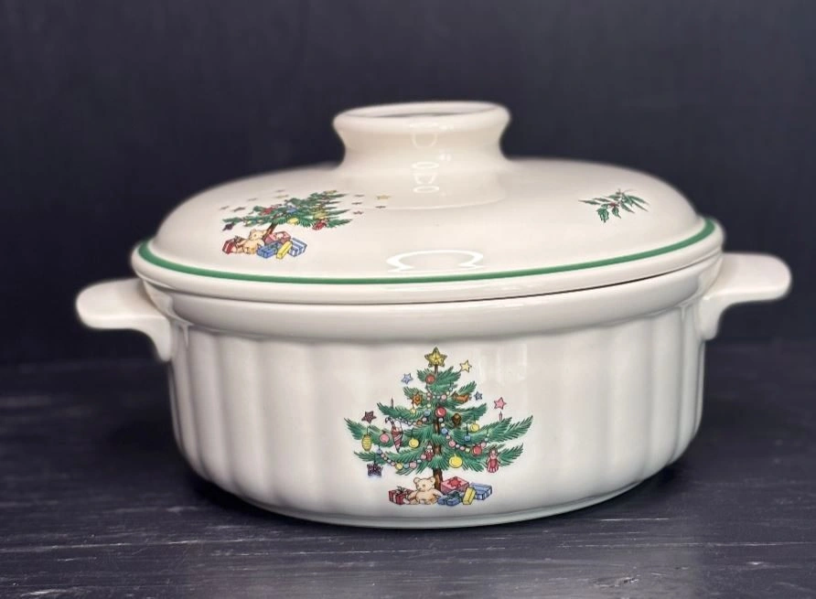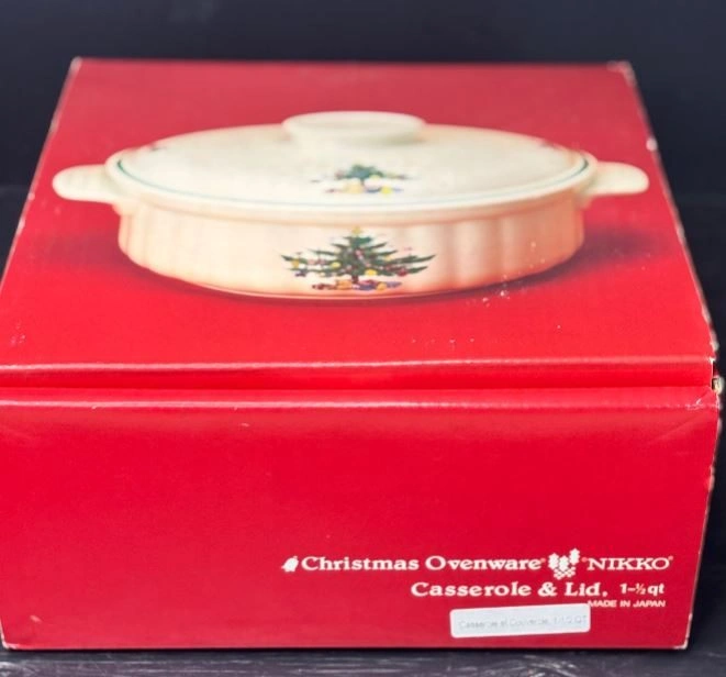 Serve your next Christmas feast and make it special with this Nikko Happy Holidays Christmas Tree Casserole Dish. This beautiful and functional casserole dish is the perfect vessel for your favorite festive recipes, from a comforting green bean casserole to a classic holiday stuffing. Not just for cooking, it is a statement piece that will be the centerpiece of your holiday table that produces warmth and tradition. The popular Happy Holidays pattern has images of Christmas trees adorned with gifts and toys as its centerpiece. This casserole dish, with its sturdy handles and elegant, scalloped body brings that same festive spirit to your home. It is designed to be used as an oven to table dish and a decorative cookware piece for all of your Christmas gatherings that will make every meal a joyous occasion. With its 8.5 inch diameter and 4.5 inch depth, it can easily house a roast, potatoes, casserole or baked desserts. Add this wonderful Nikko Happy Holidays Christmas Tree Theme Casserole Dish to your festive cooking collection or use it as a decorative dish, it is a fantastic find for collectors of Nikko's timeless Happy Holidays pattern, as well as for anyone who wants to start a new holiday tradition with a classic, high quality piece. This is brand new, old stock and has never been used. Local pickup is in Etobicoke near Islington and The Westway. We offer shipping and local delivery for this item. Please send a message about availability and cost associated with these respective services. Alternately, if you wish to pay by credit card or Paypal and have it shipped, you can order it on our website by copying and pasting this link into your browser: https://hljathome.com/products/nikko-christmas-tree-theme-casserole-dish-new