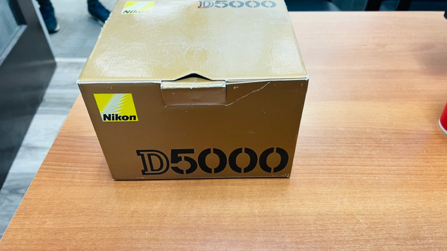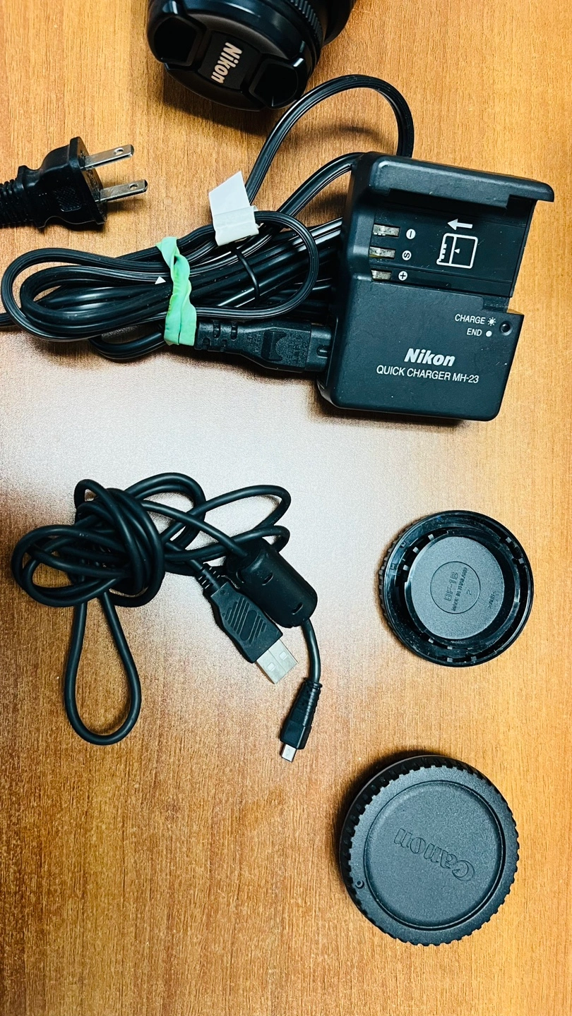 DSLR camera with lens, charger, and accessories. Includes original box.