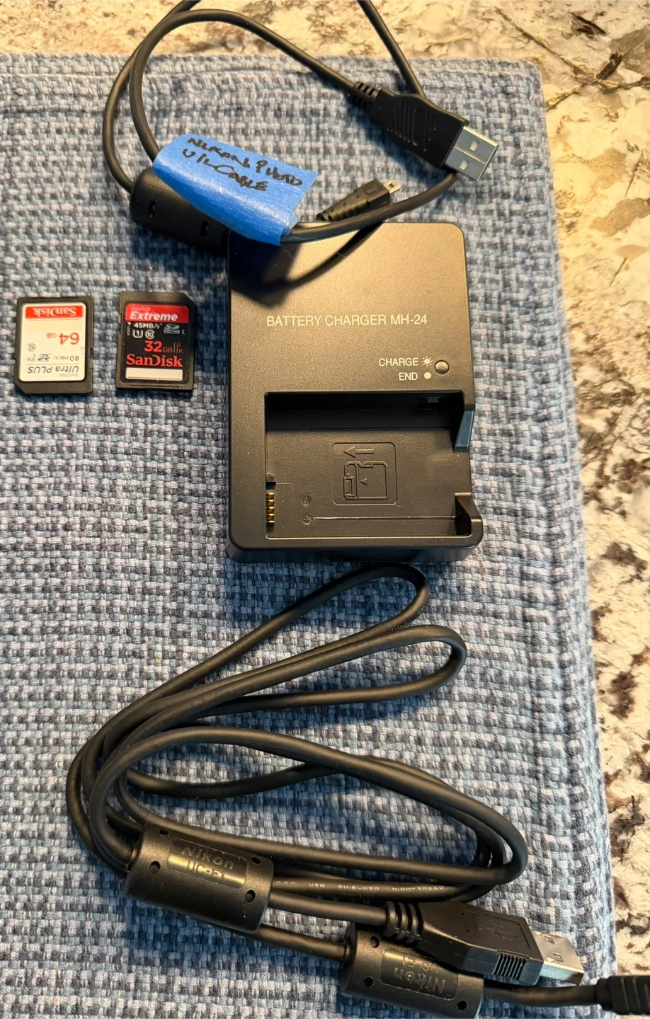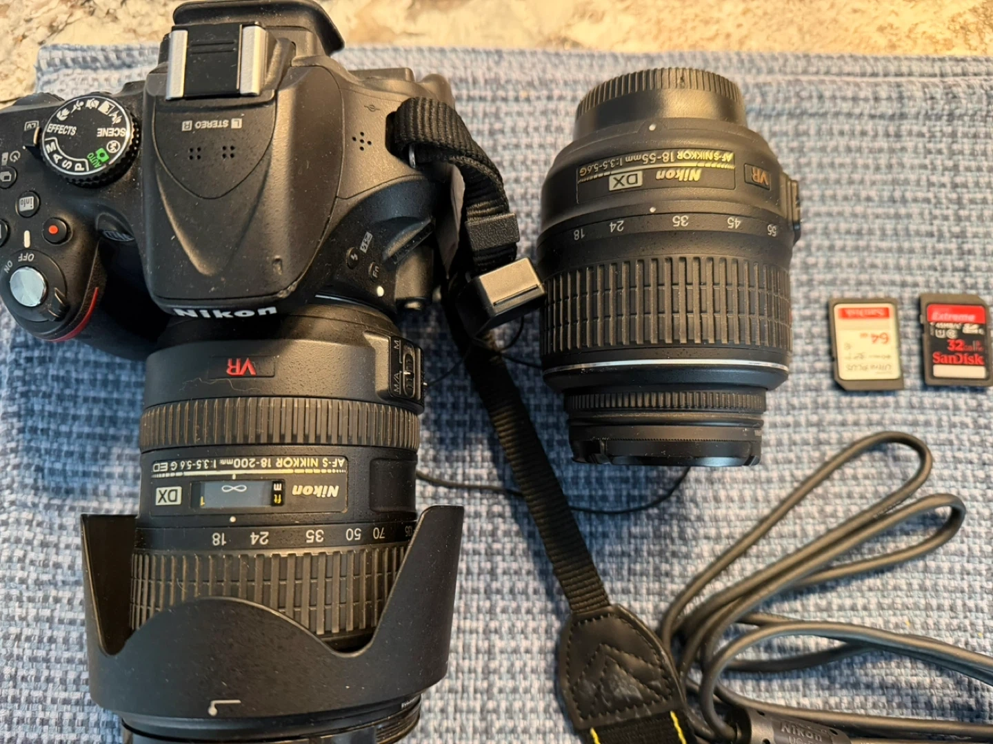 Selling a Nikon D5200 DSLR camera. It comes with two lenses: an AF-S NIKKOR 18-200mm 1:3.5-5.6G ED lens and an AF-S NIKKOR 18-55mm 1:3.5-5.6G lens. Also included are two SD cards, a battery charger MH-24, and Nikon photo/video cable