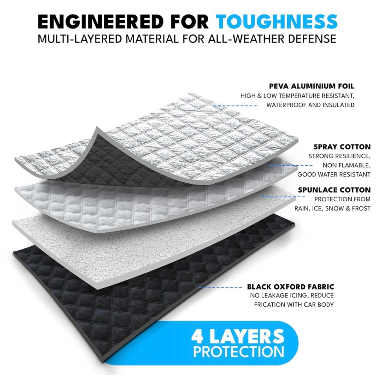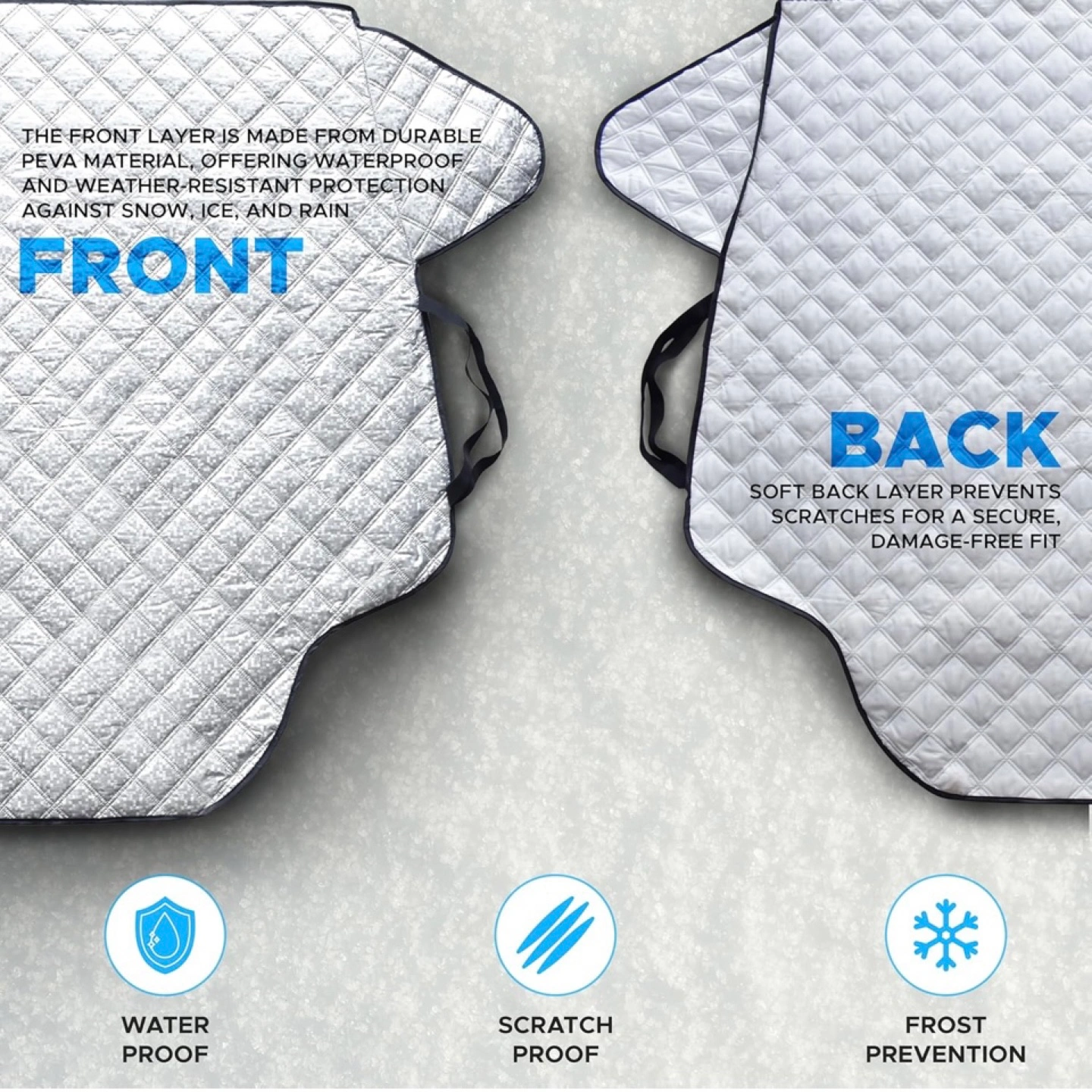 Sleek and Secure Design: Thanks to the dual mount straps, PVC insulated bottom layer, and dual side flaps, our car snow cover fits secure without getting slipped or blown away, even in the roughest winds.