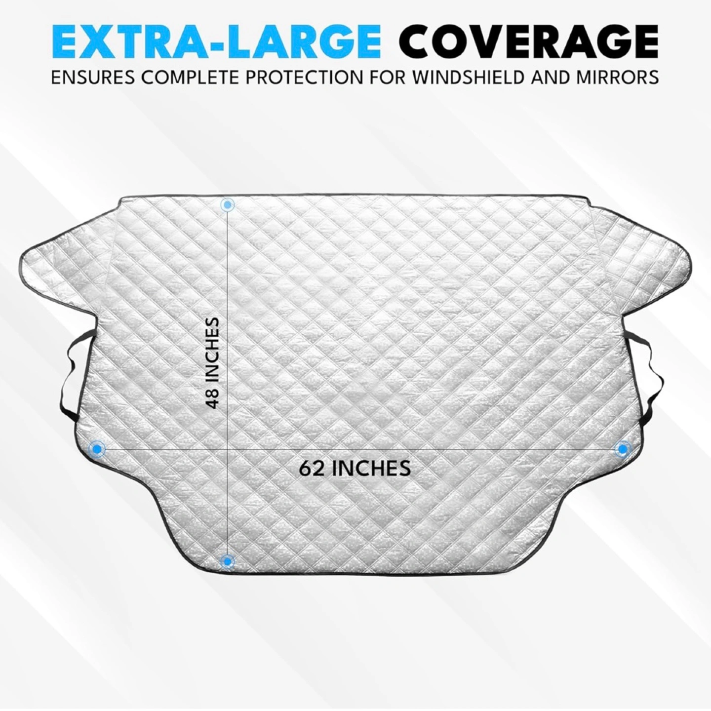 Compatible with Most Vehicles: Our snow windshield cover measuring 62 inches in length and 48 inches in height will cover your front windshields from end to end. It also comes in two sizes to accommodate most cars, SUVs, Vans, and Trucks with ease!