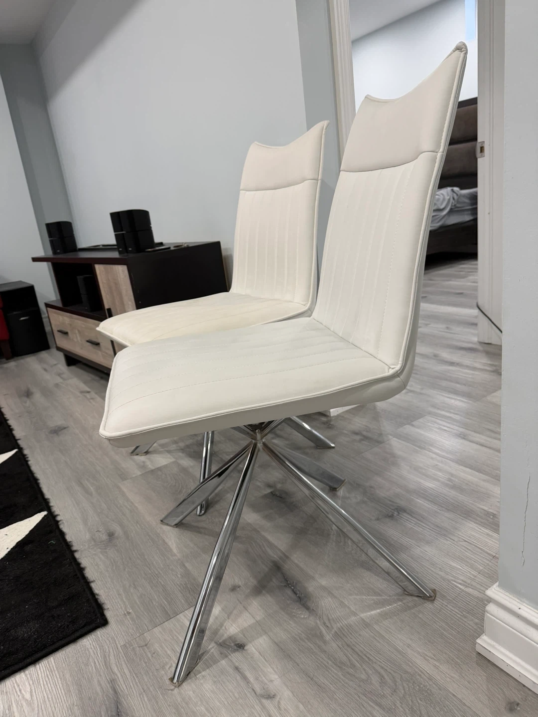 These two white dining chairs feature a modern design with sleek chrome legs. Upholstered in what appears to be faux leather, they offer a comfortable seating option. The chairs have a unique star-shaped base, adding a contemporary touch to any dining space. They're perfect for adding a stylish flair to your kitchen or dining room! Need to be gone asap