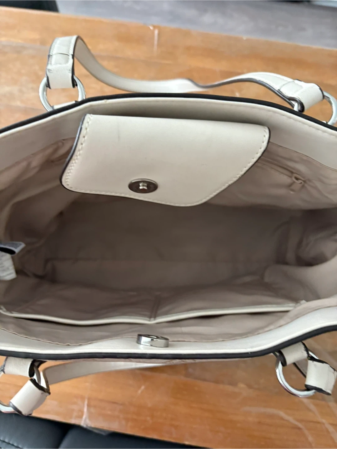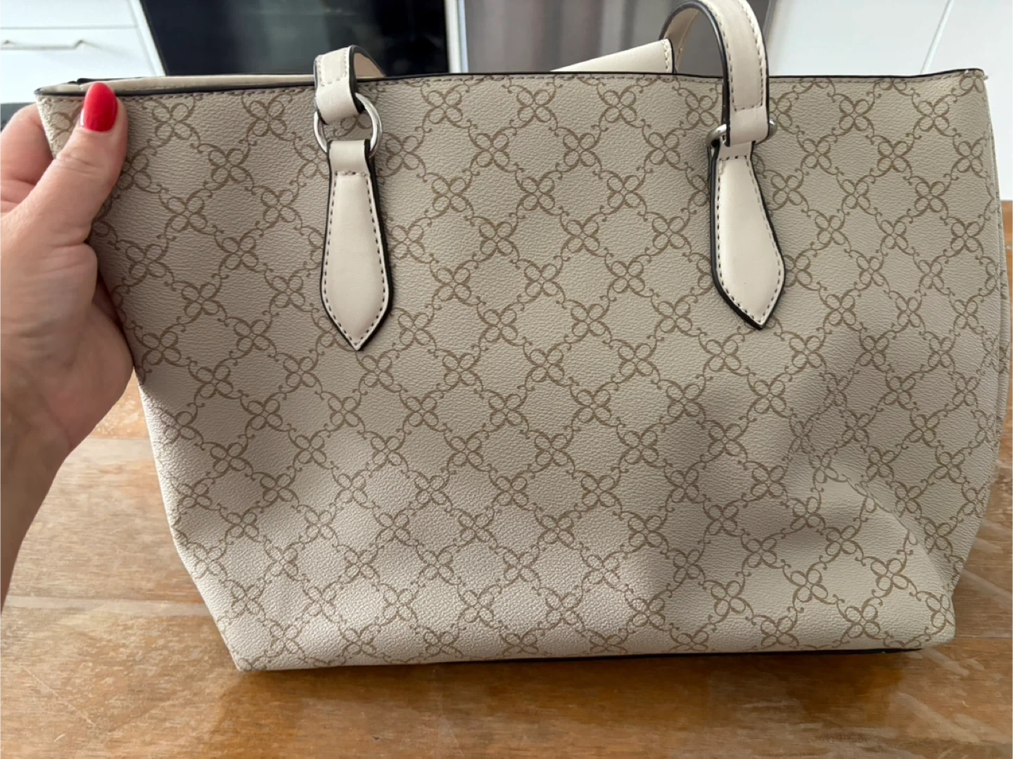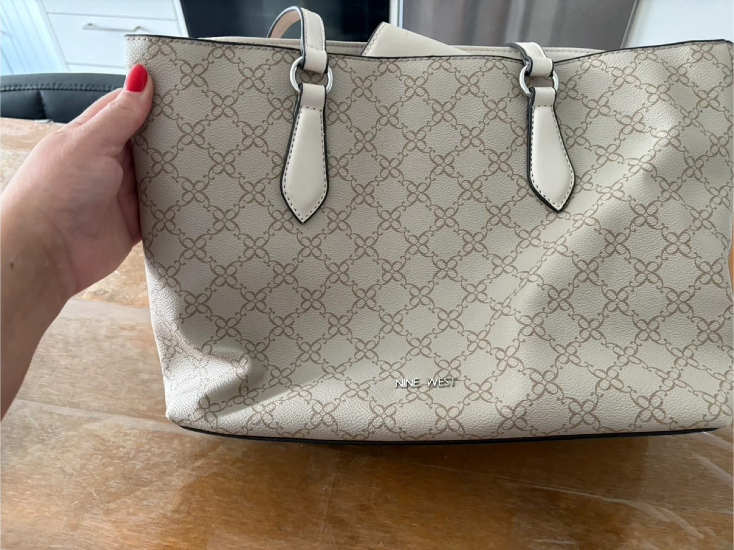 Selling a Nine West tote bag with a beige patterned design. It's in great condition and perfect for everyday use! The bag features a spacious interior with multiple pockets for organization.