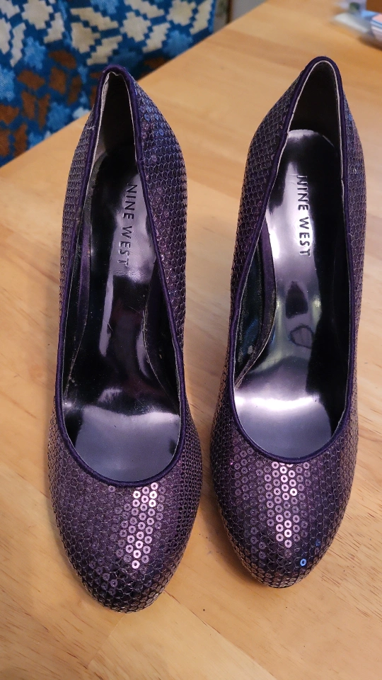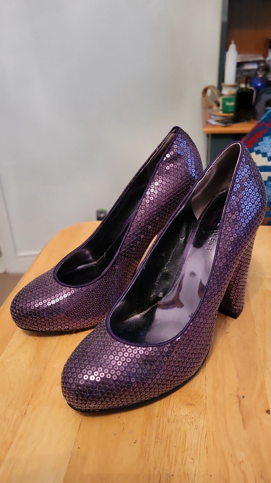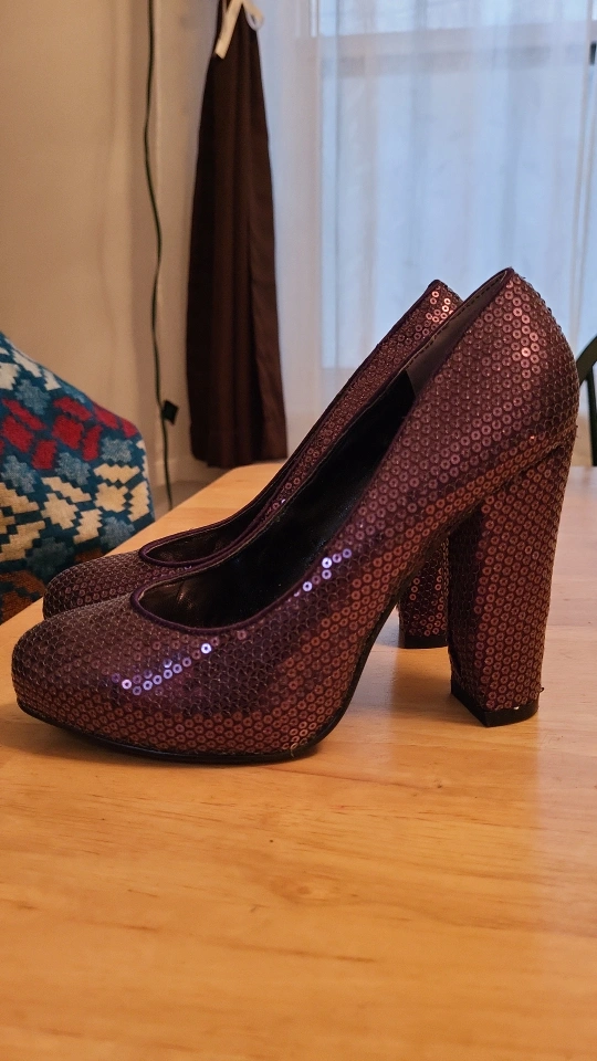 Purple sequined heels with a thick heel. Size 5