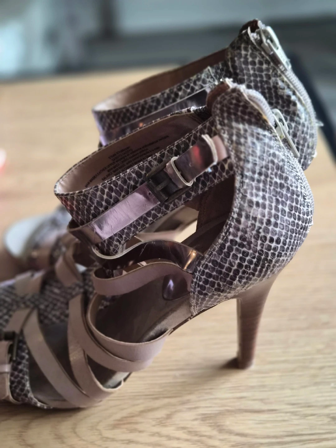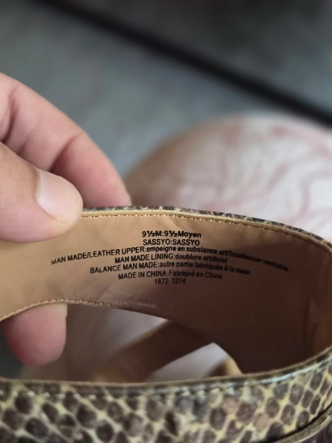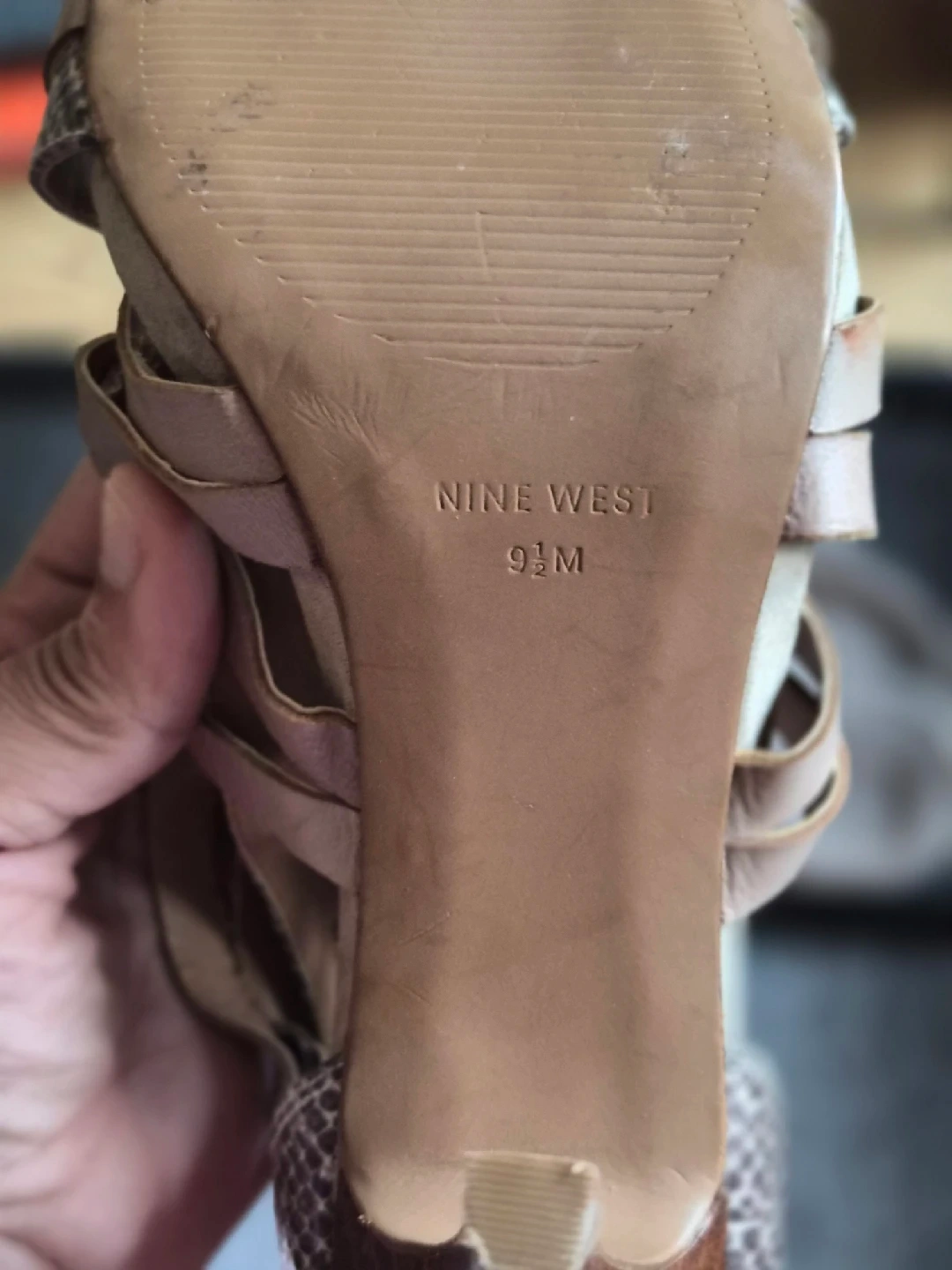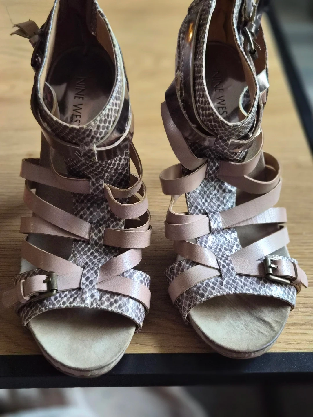 10Nine West heels in a stylish snake print! These heels are a size 9.5 and feature a strappy design with buckle closures. The material is man-made leather upper and lining. Perfect for adding a touch of flair to any outfit!