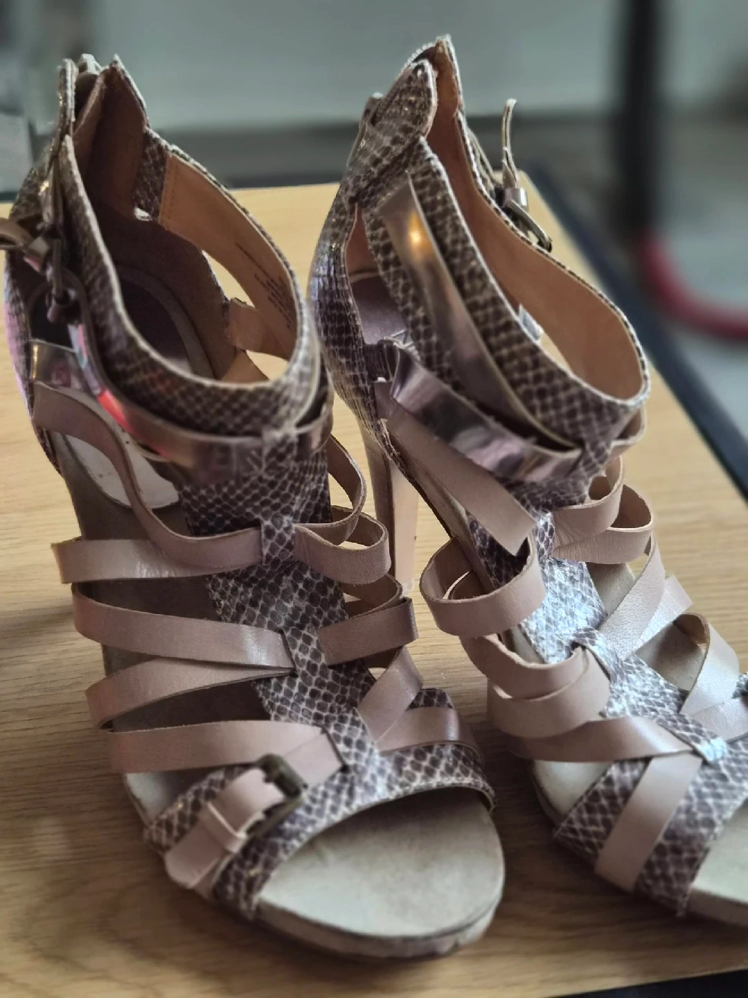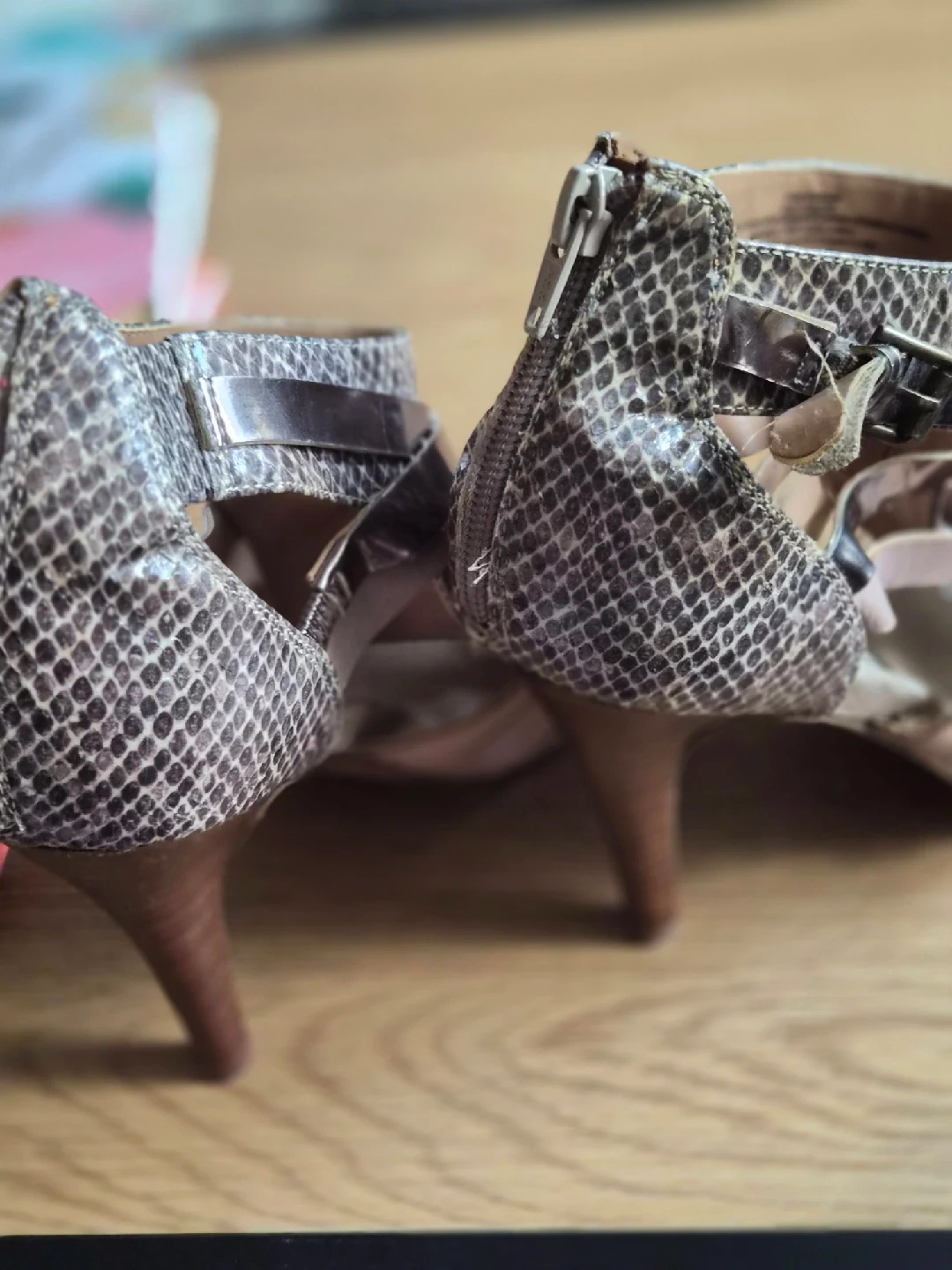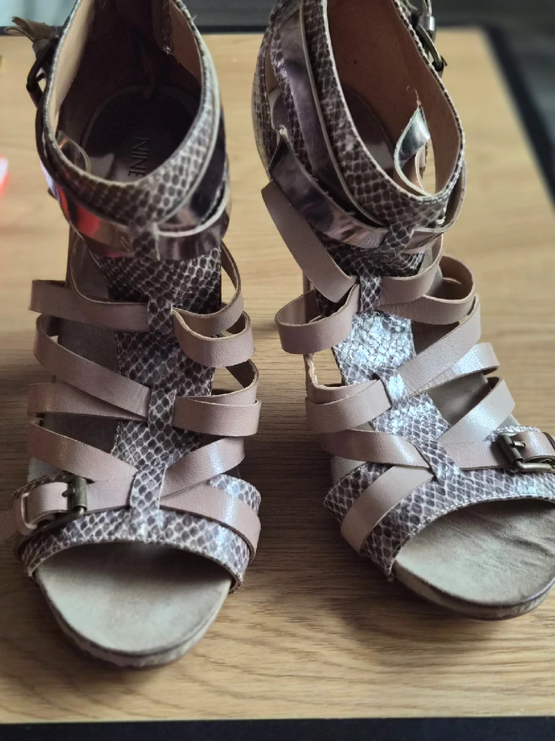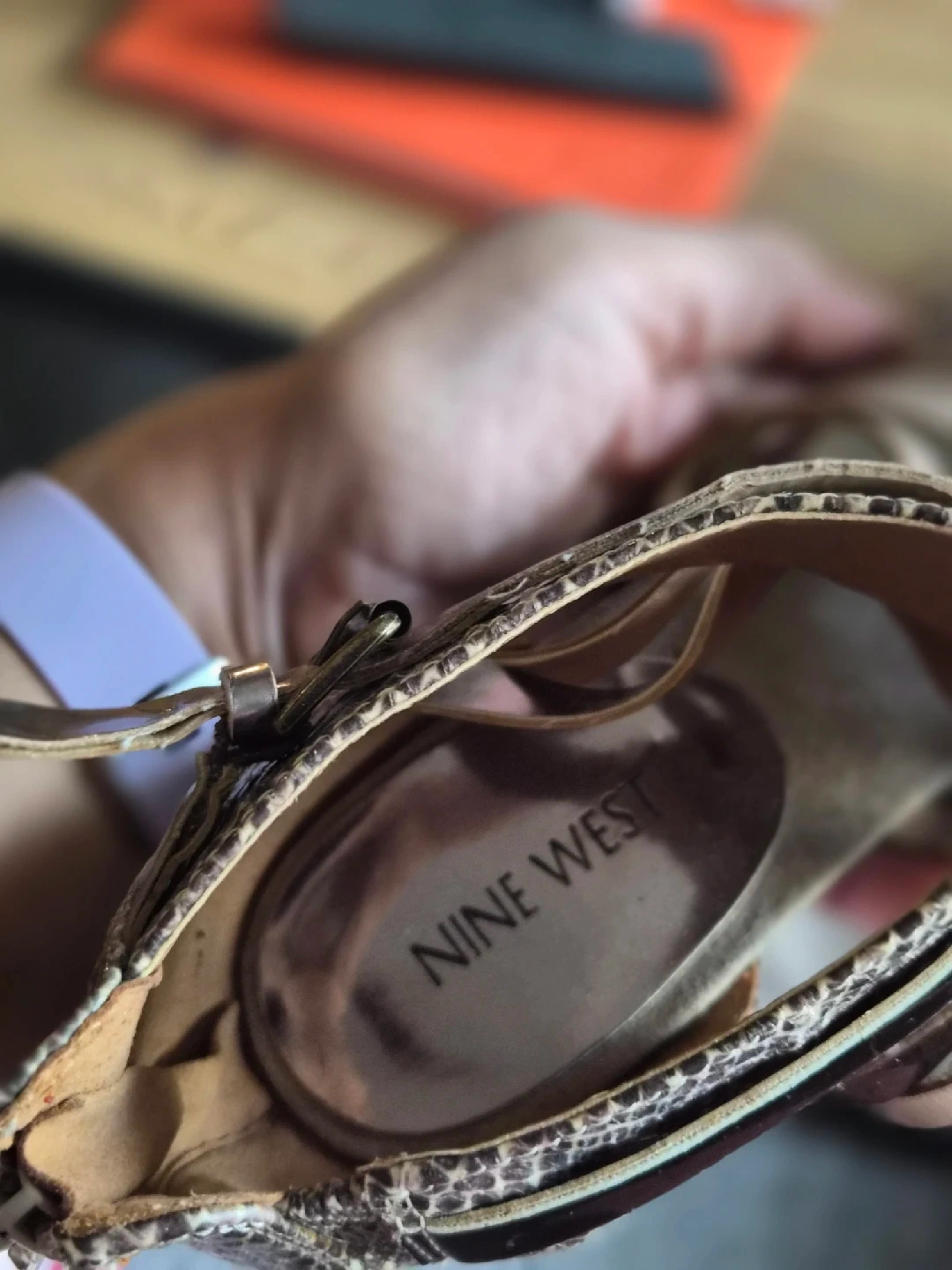 10Nine West heels in a stylish snake print! These heels are a size 9.5 and feature a strappy design with buckle closures. The material is man-made leather upper and lining. Perfect for adding a touch of flair to any outfit!