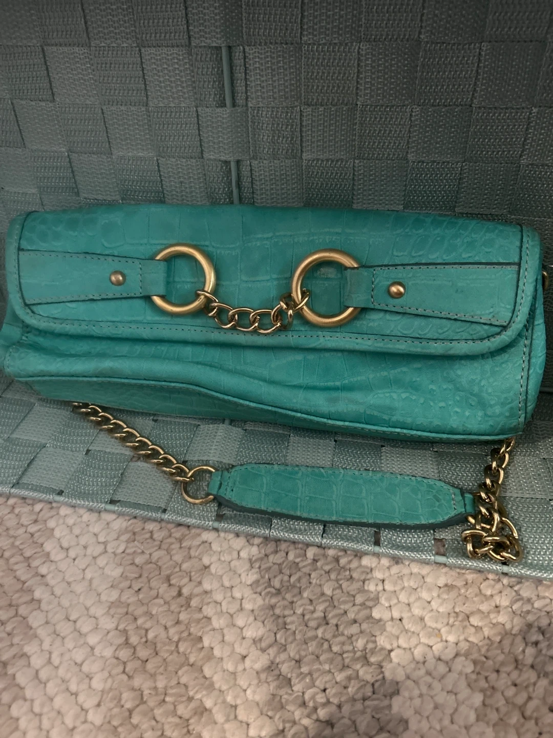 65Turquoise Nine West clutch with a gold chain strap. The bag has a faux crocodile texture and gold hardware detailing. It's perfect for a night out or a special occasion!