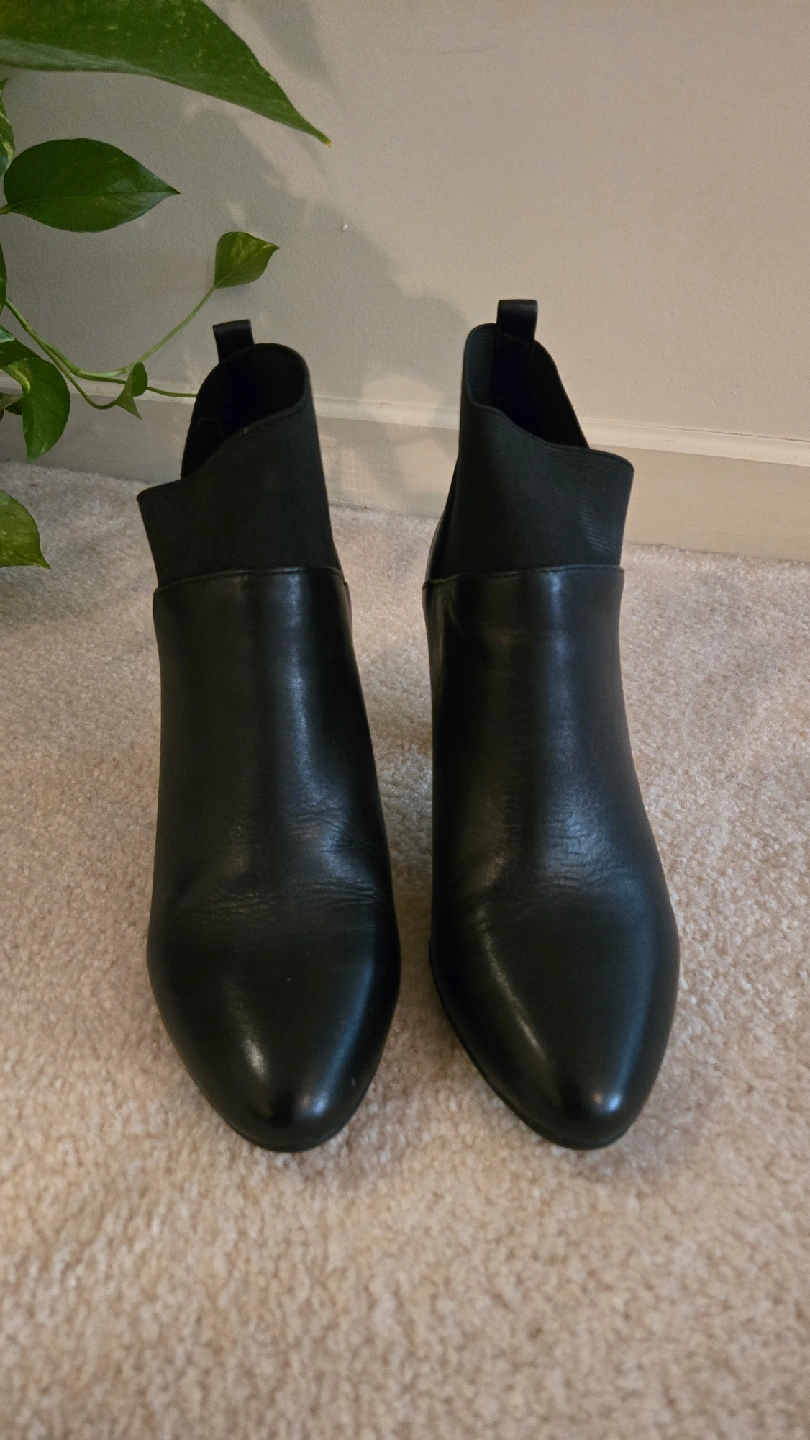 Selling a pair of stylish black leather ankle boots in excellent condition! They are a size 8 and feature a comfortable block heel. Perfect for dressing up or down!
