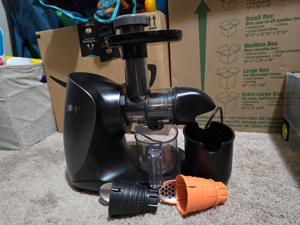 Ninja brand cold press juicer. Includes three interchangeable pulp filters. Great for making juice at home. Used but in good condition.