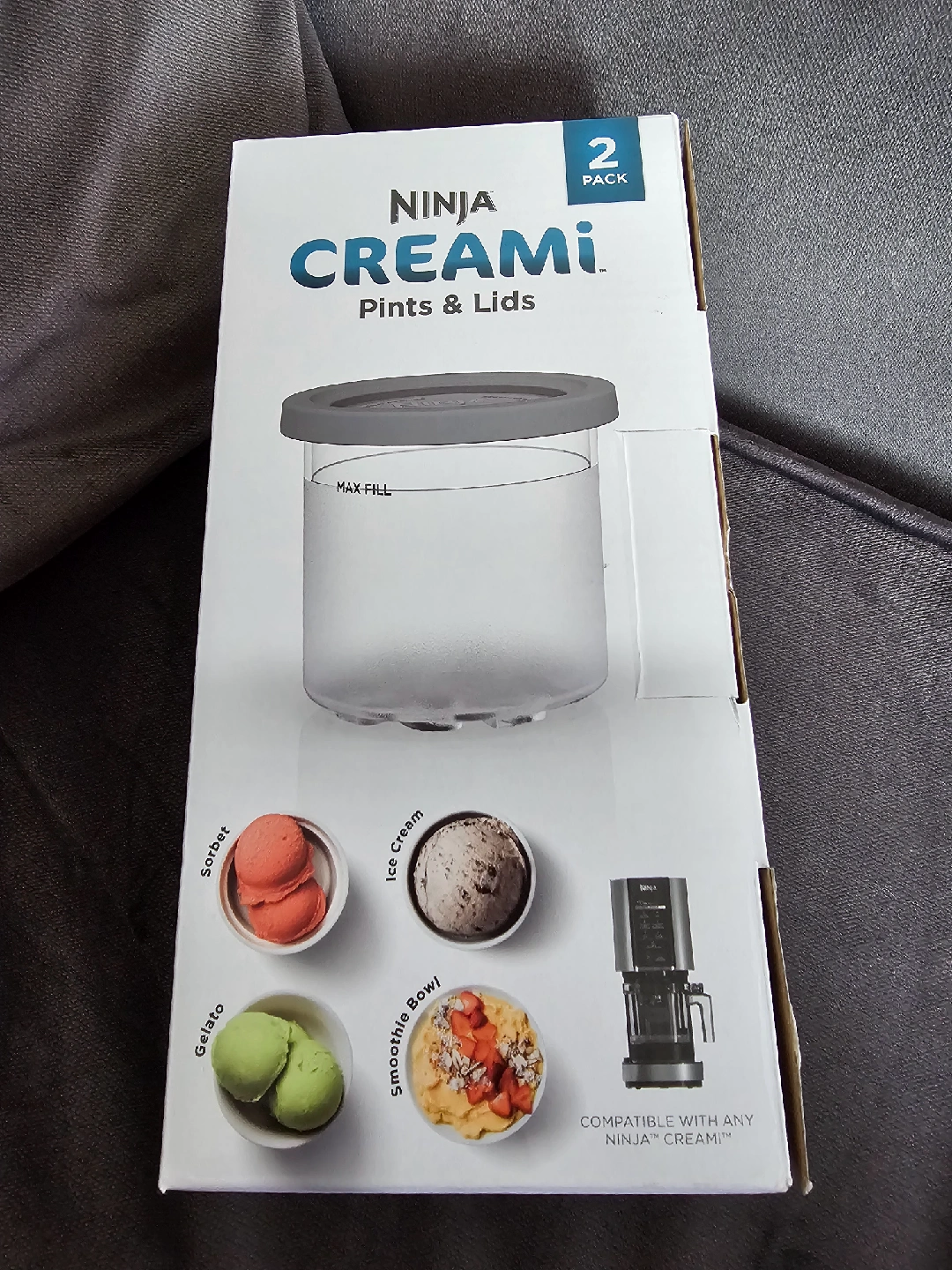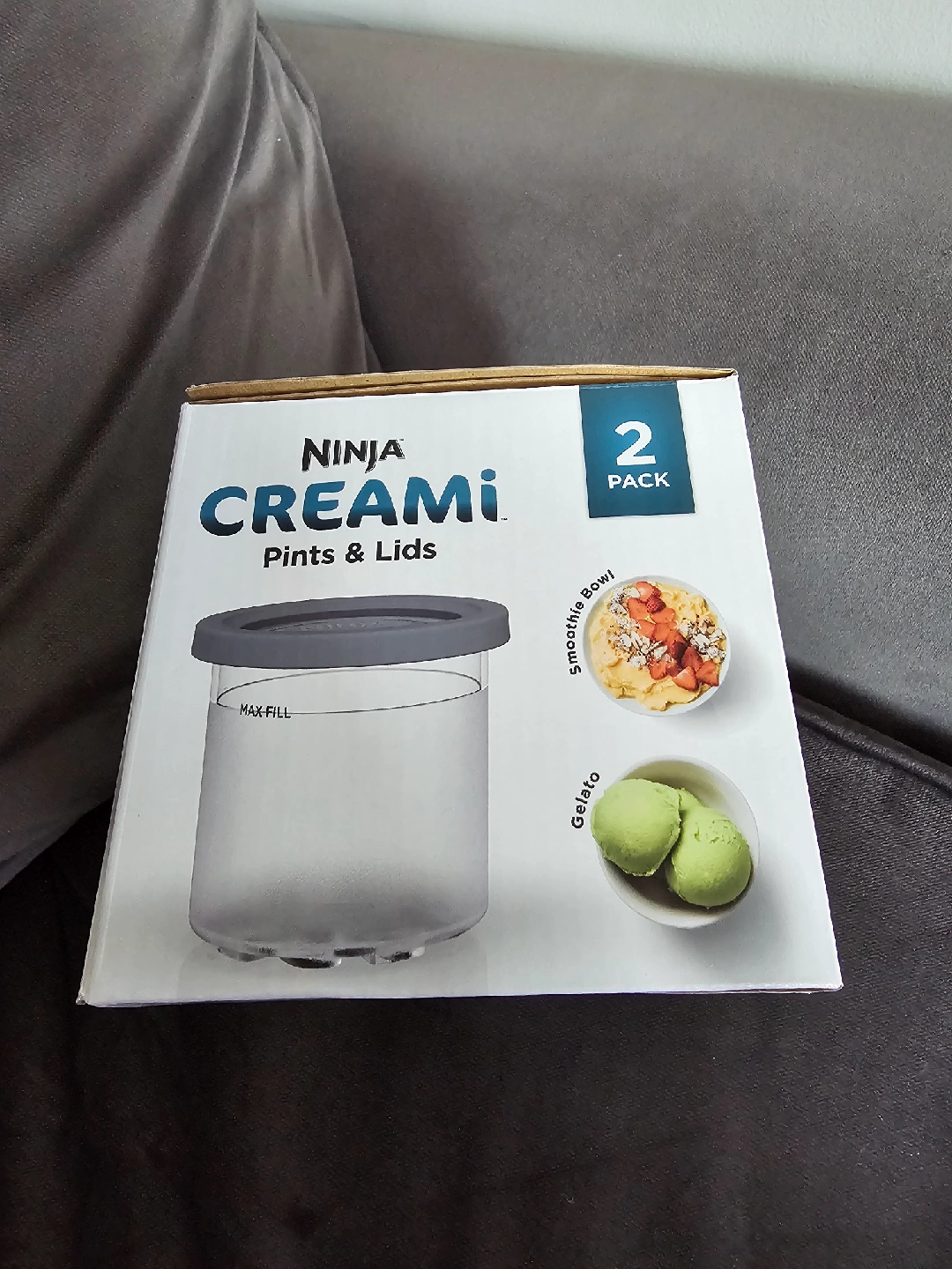 BNIB Qty: 2 $21/each box of 2-pack Includes CREAMi Pints (x2) and Storage Lids (x2) Compatible with any NINJA CREAMi Perfect for ice cream, gelato, smoothies bowls, sorbets, and any frozen dessert treats Reusable Easy to store Stackable BPA-free Dishwasher-safe FINAL SALE Accepting cash only please