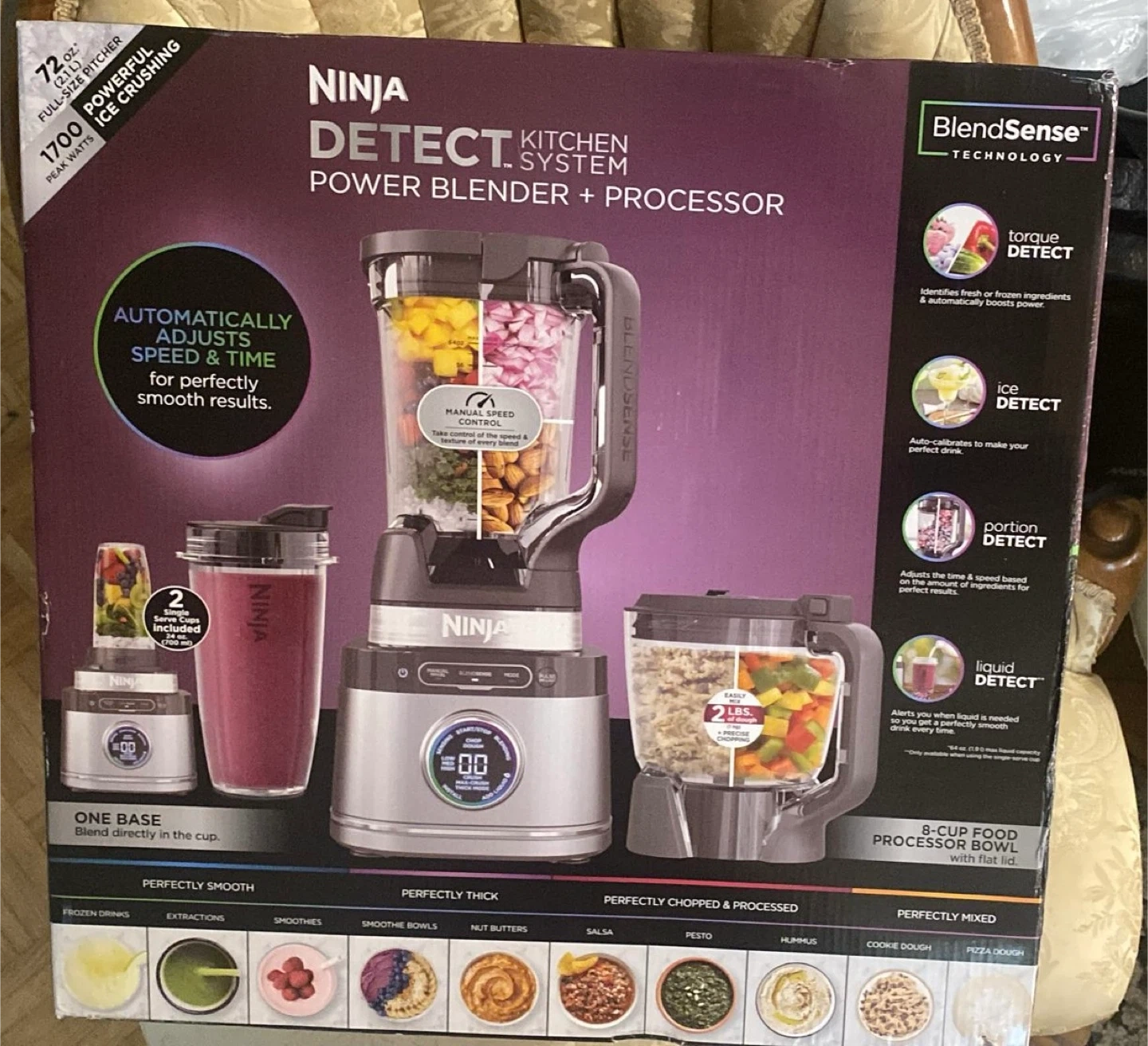 167Selling a Ninja Detect Kitchen System Power Blender and Processor. Brand new in unopened box. It has BlendSense Technology and automatically adjusts speed and time for smooth results. It has torque, ice, portion, and liquid detect features. Comes with a 72oz full-size pitcher and an 8-cup food processor bowl with a flat lid. Also includes two single-serve cups.