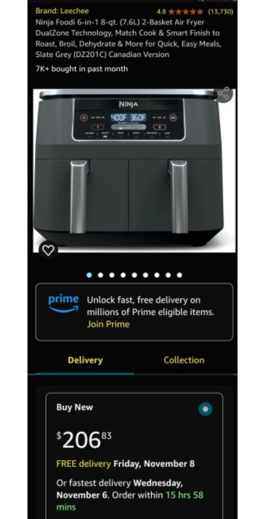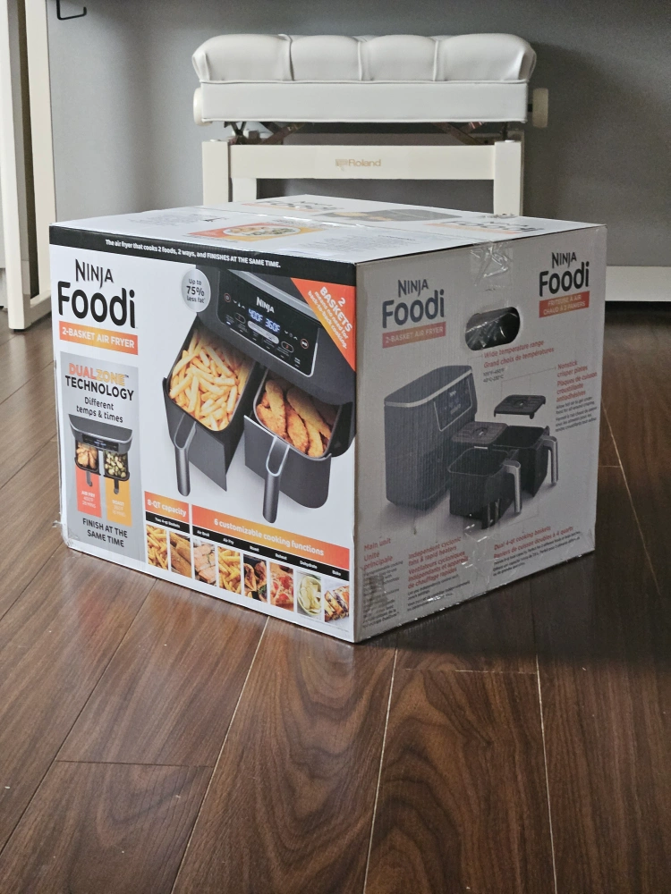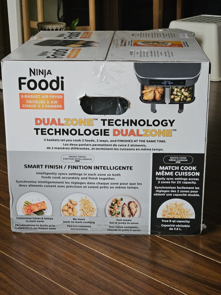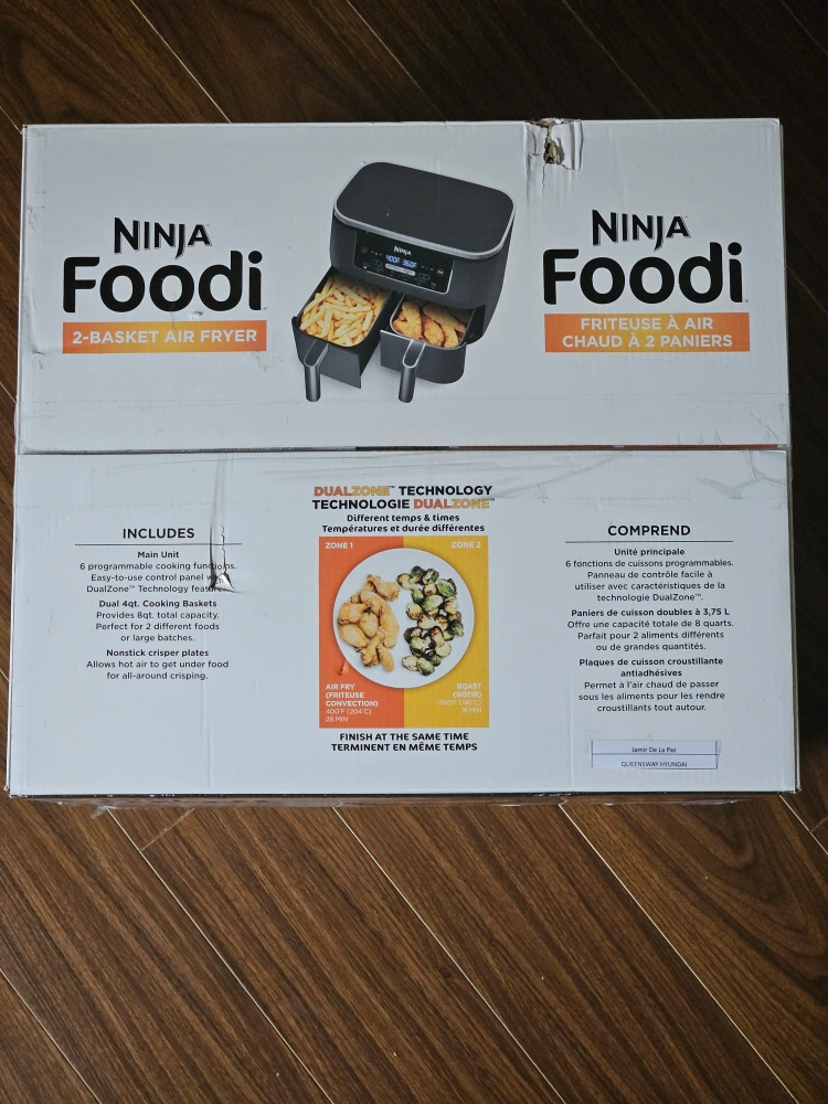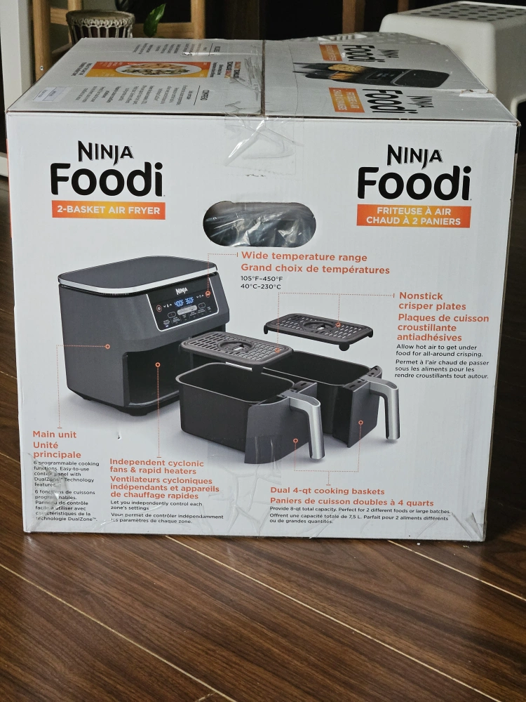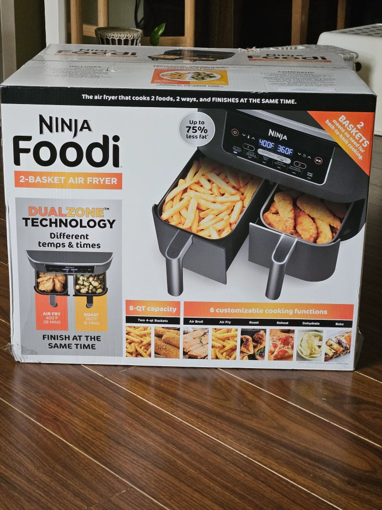 Brand new! Unopened Box! 2-Basket Air Fryer. DualZone technology. 8-quart capacity. 6 customizable cooking functions. Up to 75% less fat. The first air fryer with 2 independent baskets that lets you cook 2 foods, 2 ways, at the same time, not back to back like a traditional single-basket air fryer. DualZone Technology features Smart Finish feature for cooking 2 foods 2 ways that finish at the same time, and a Match Cook button to easily copy settings across zones for full 8-qt capacity. 6 customizable programs: Air Fry, Air Broil, Roast, Bake, Reheat, and Dehydrate. 8-qt. XL capacity lets you fit mains and sides at the same time for making quick family meals, or up to 4 lbs. of French fries or chicken wings. 2 independent 4-qt. zones have their own cooking baskets, cyclonic fans, and rapid heaters. Wide temperature range: 105°F–450°F. Condition: BRAND NEW! Unopened box Pick up at Warden/Finch (near Bridlewood Mall)
