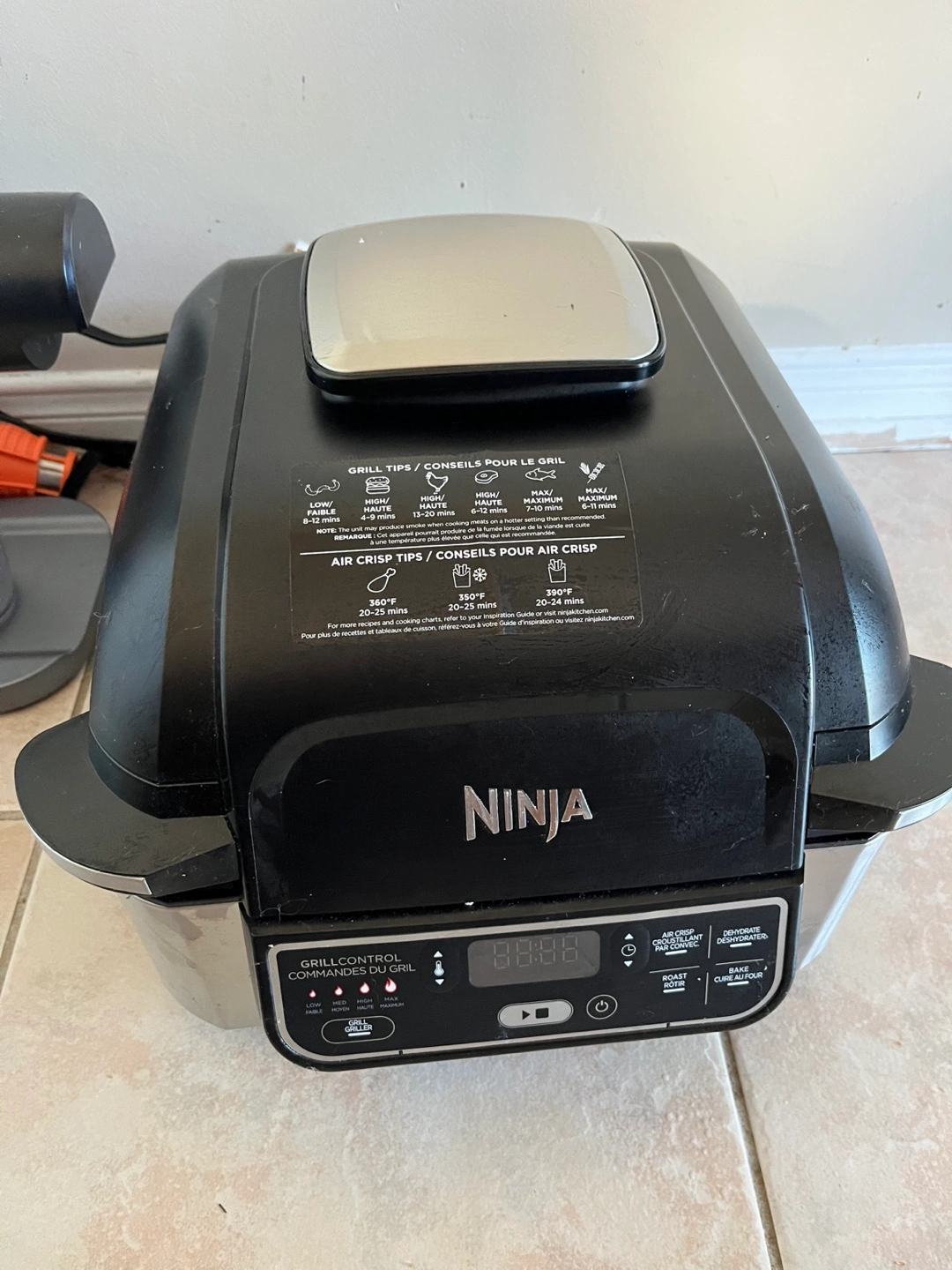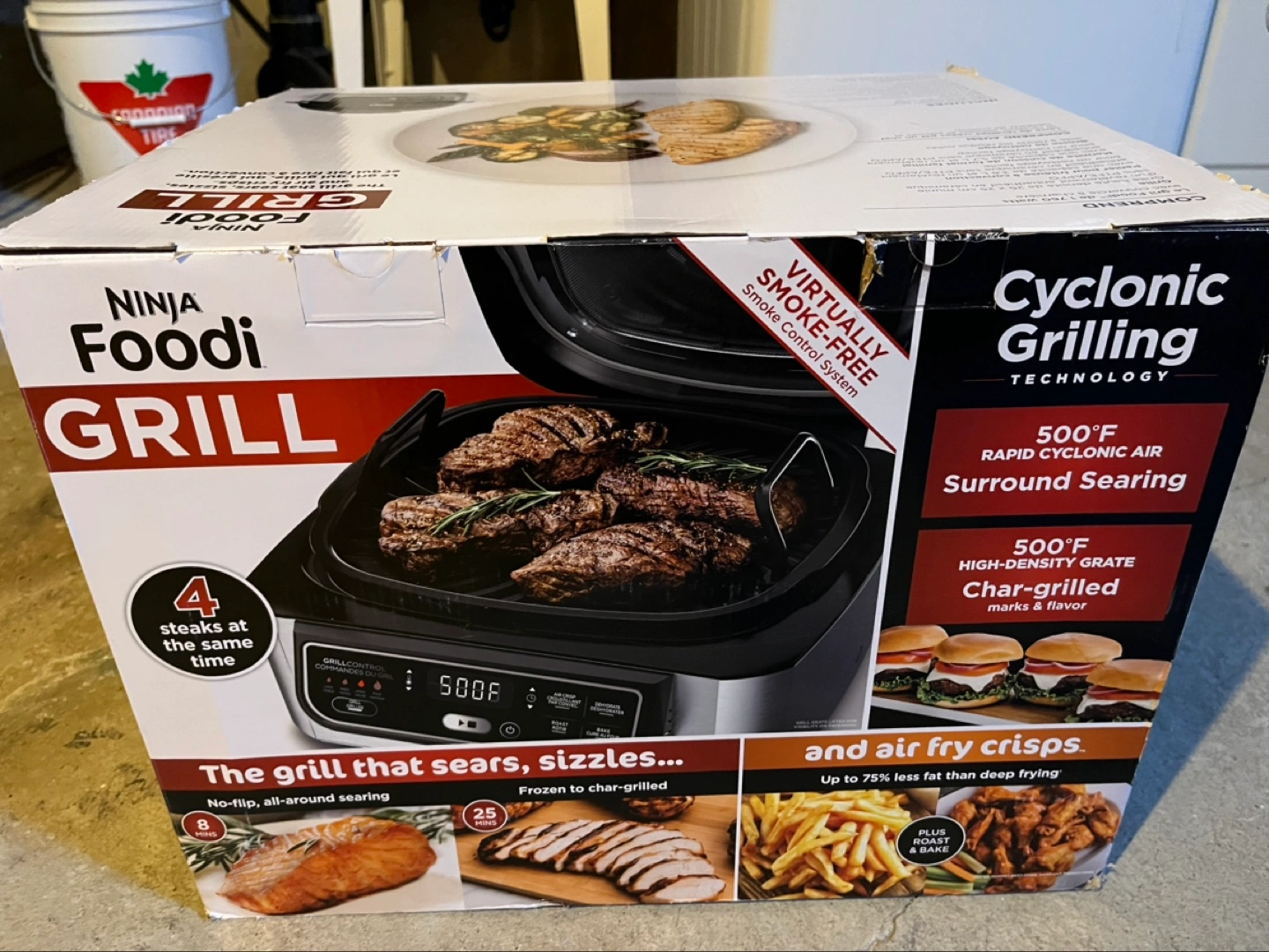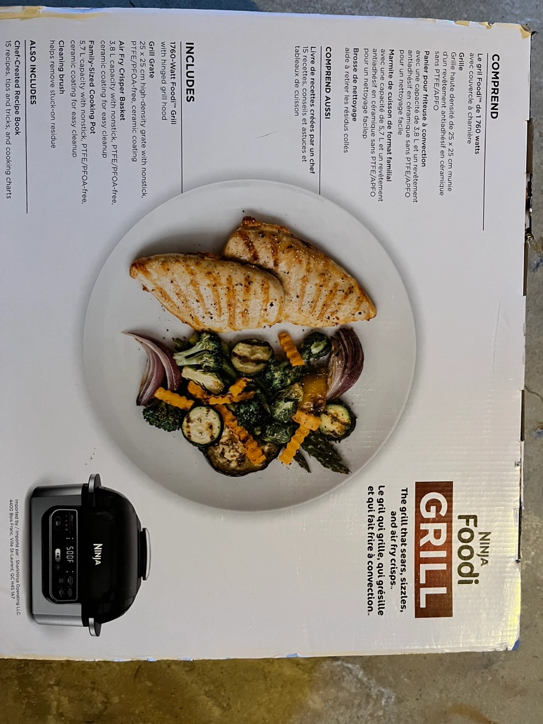 59Ninja Foodi Grill. Features cyclonic grilling technology. Versatile appliance; grills, air crisps, and roasts. Includes grill grate and crisper basket. With original packing