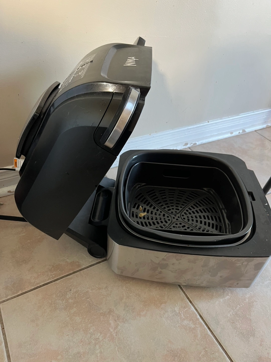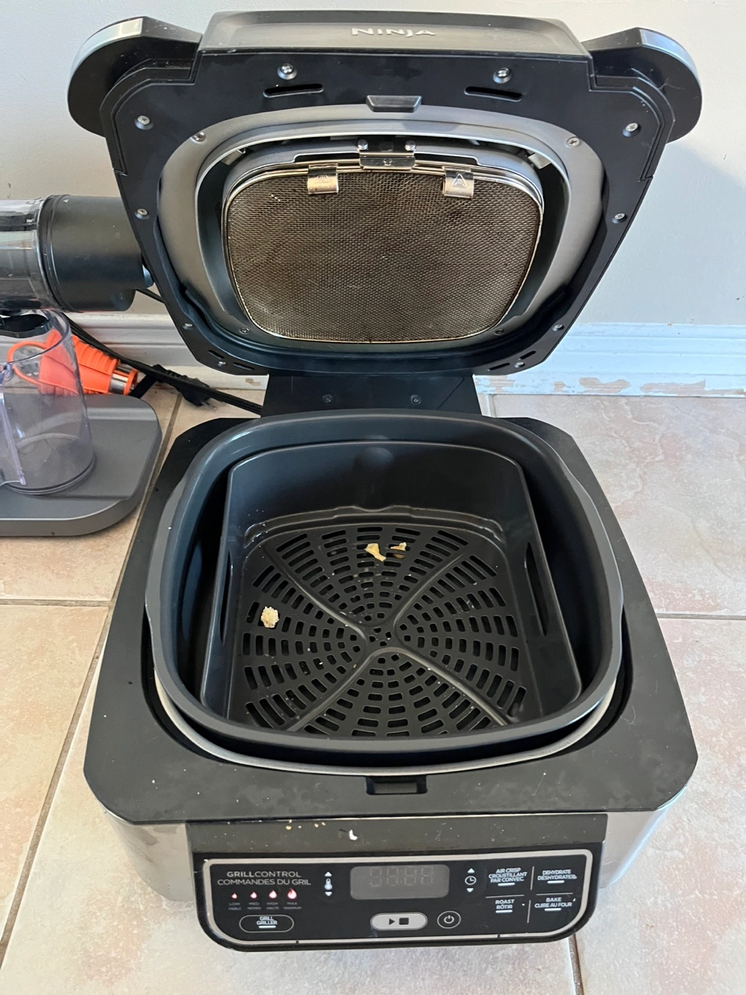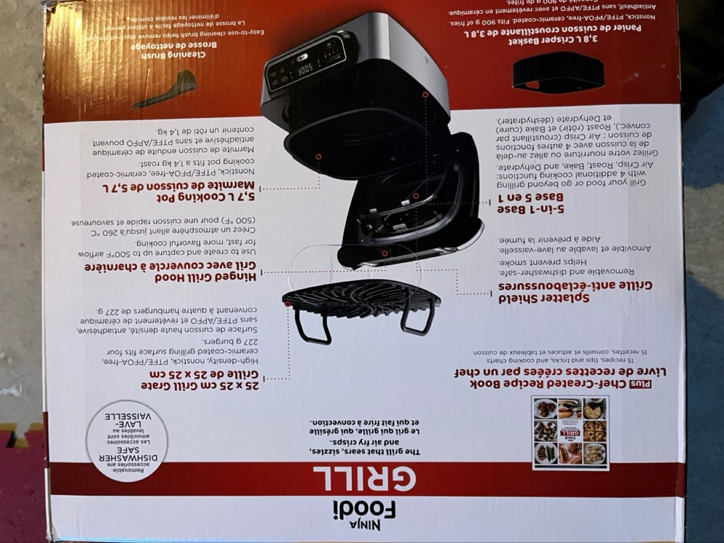 59Ninja Foodi Grill. Features cyclonic grilling technology. Versatile appliance; grills, air crisps, and roasts. Includes grill grate and crisper basket. With original packing