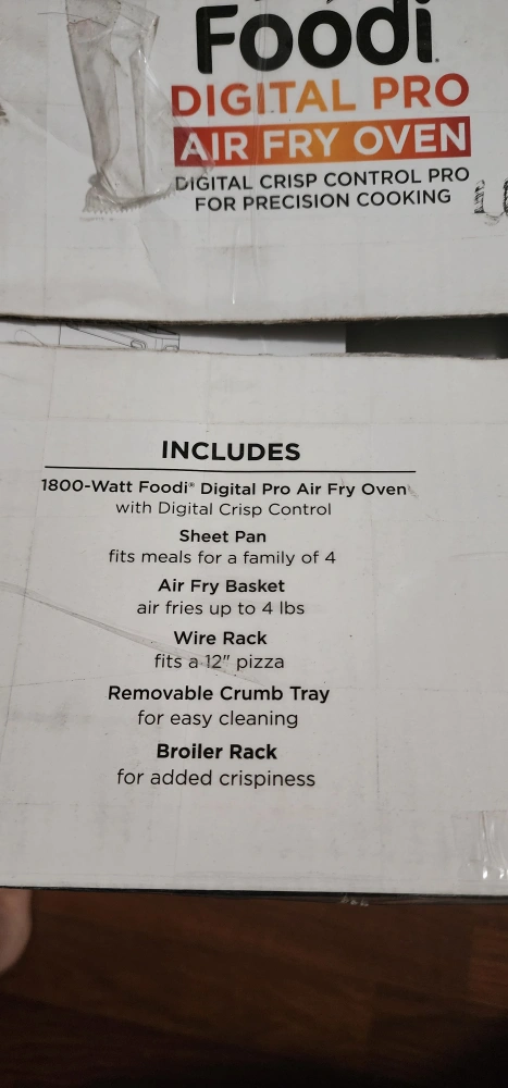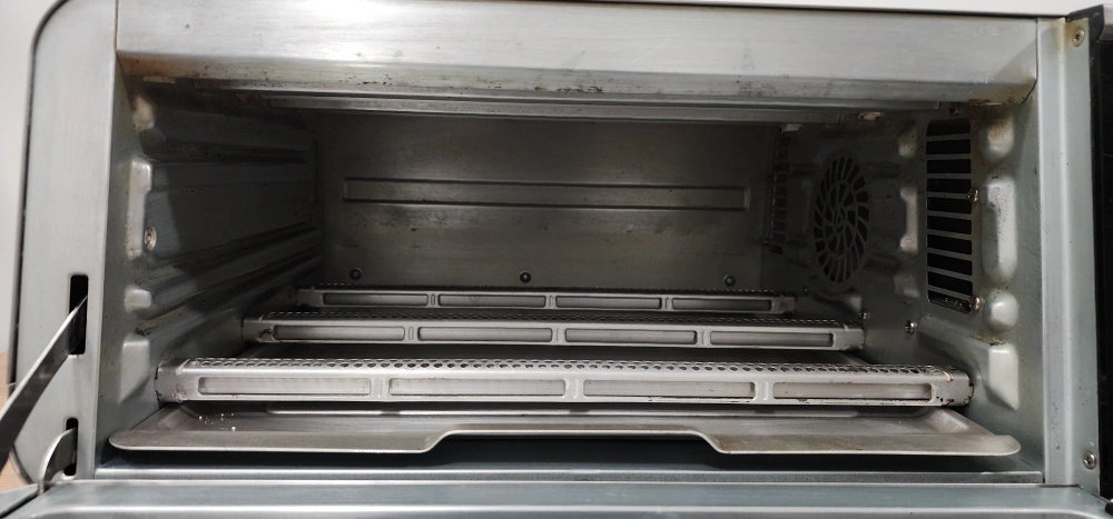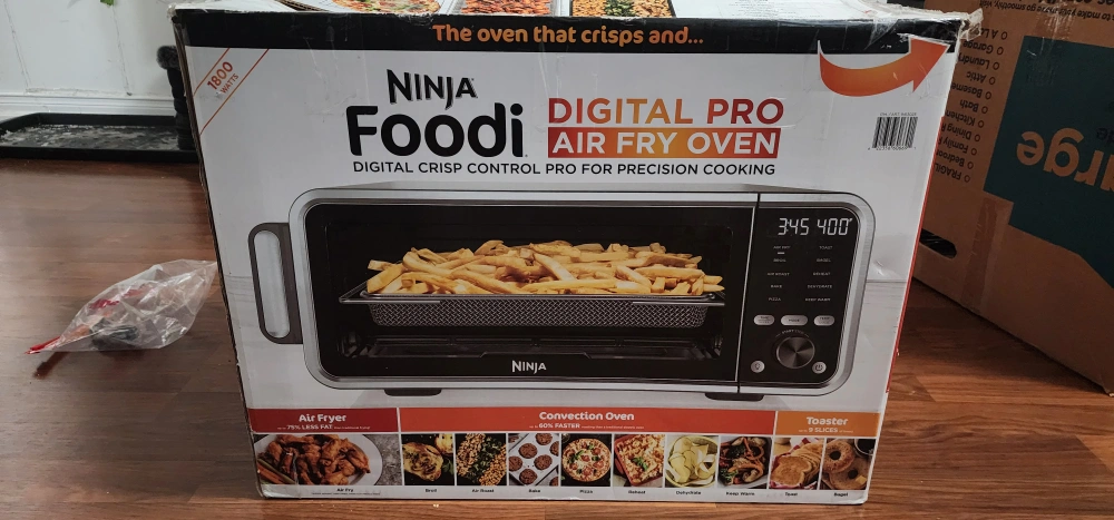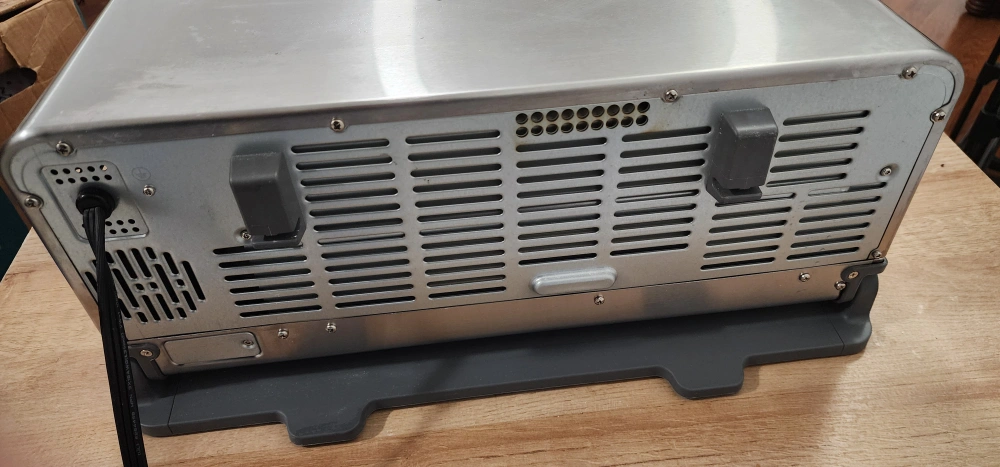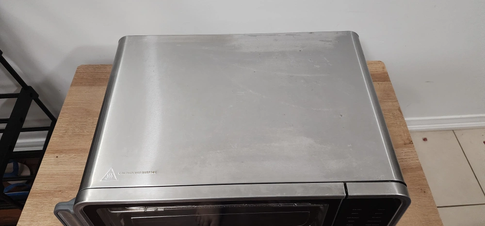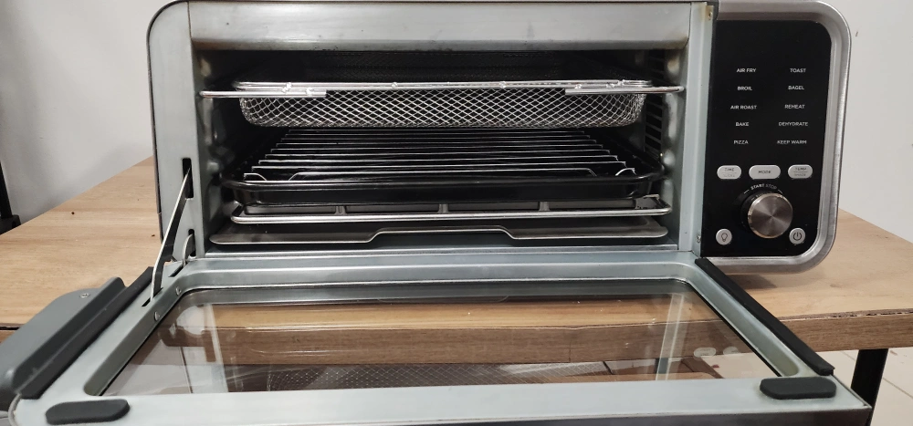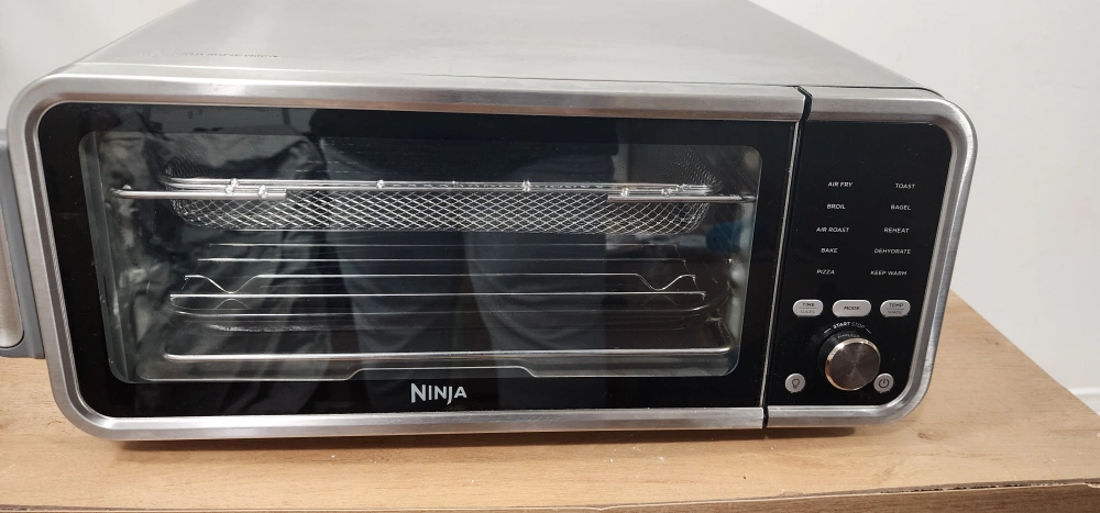 Stainless steel air fryer oven. Multiple functions: air fry, toast, bake, roast, dehydrate, pizza. Includes sheet pan, Air fry basket, wire rack, removable curb tray, broiler rack. Used gently.
