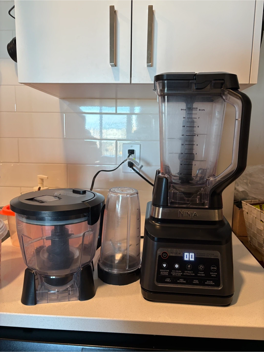 28Ninja Kitchen System with Auto-iQ. This blender is great for smoothies, ice crushing, and extractions, however does heat up fast. It also has a food processor jar with dough pate which works perfectly.
